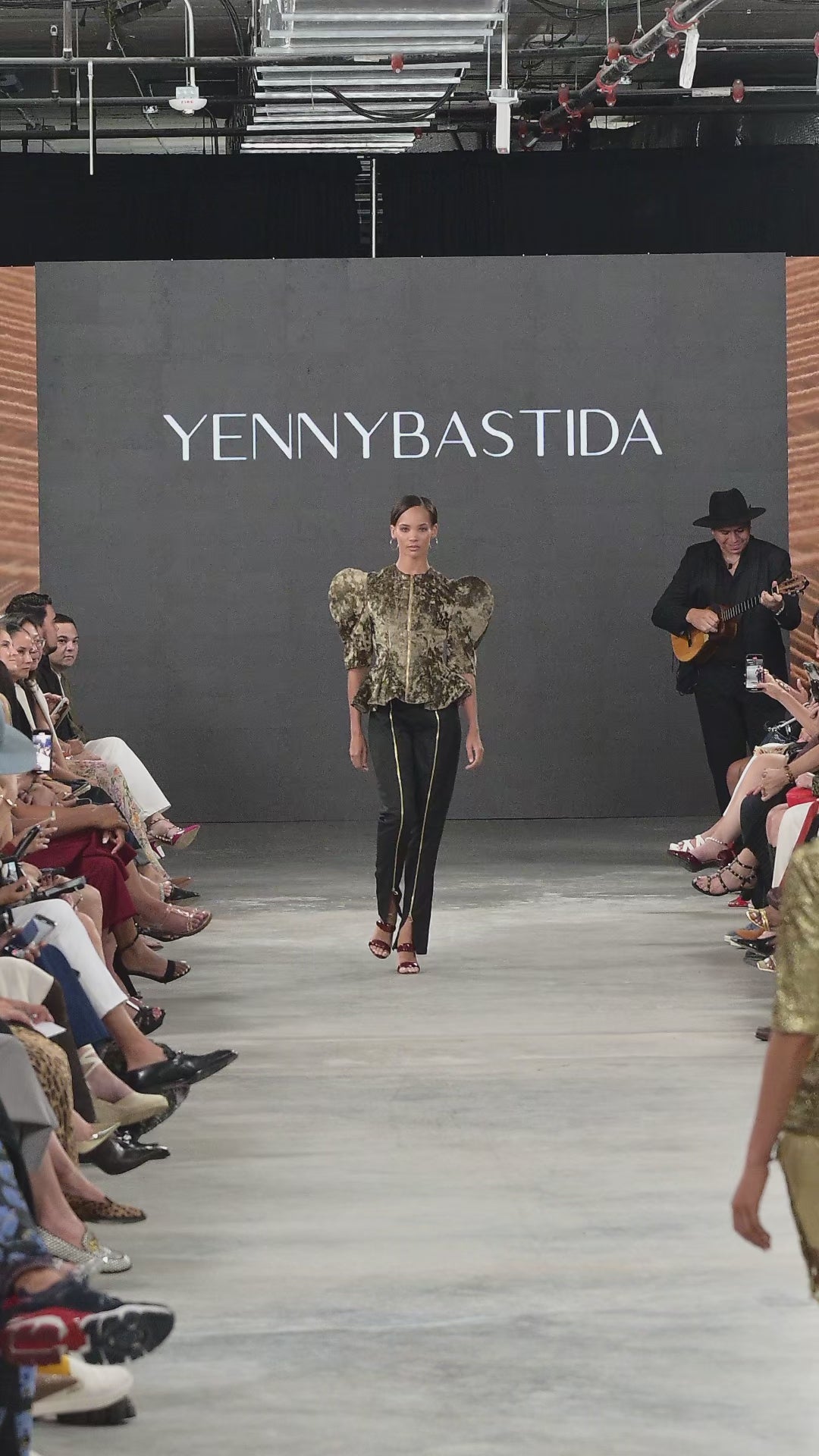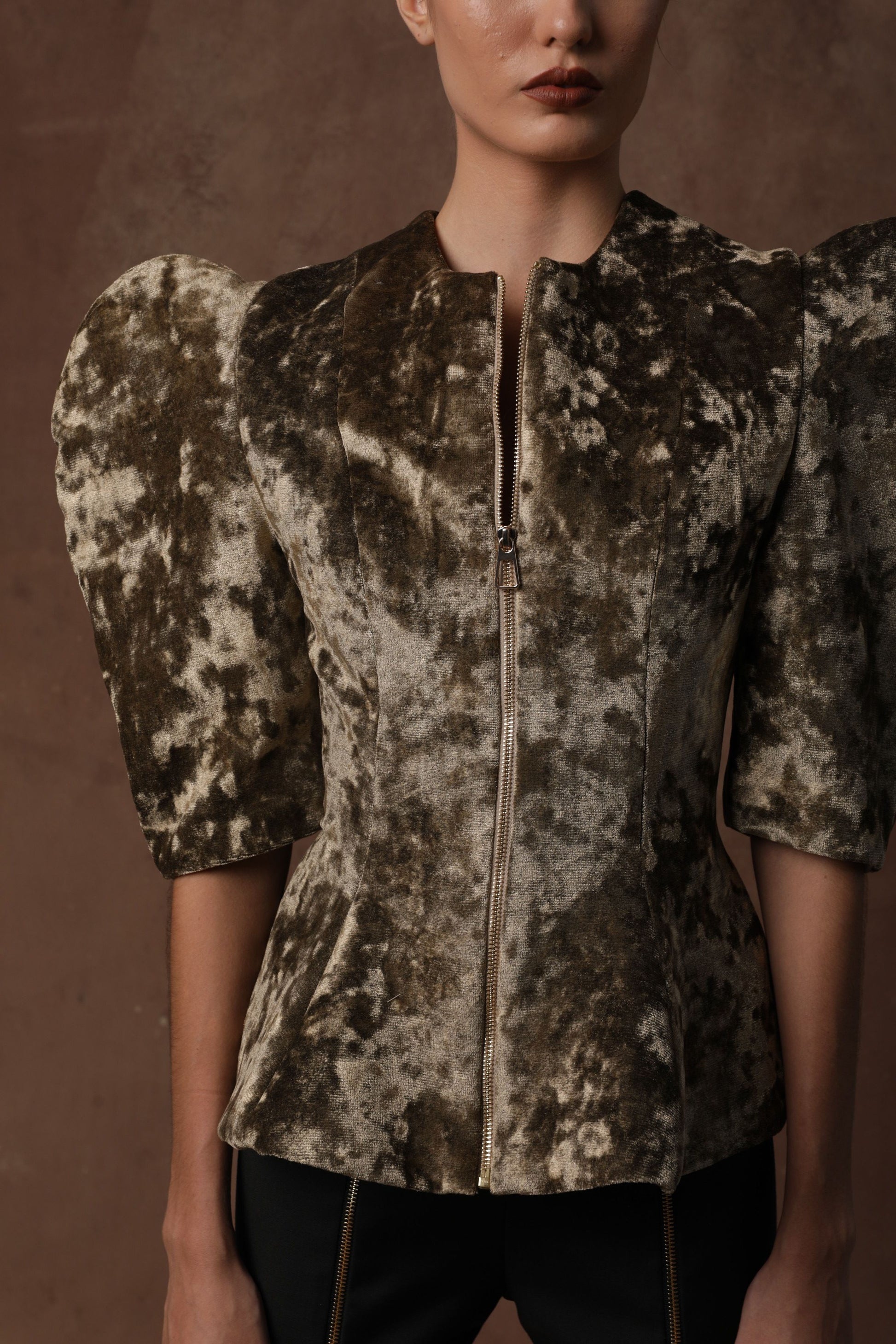 Blusa estructurada con corte tipo peplum en la cintura, elaborada en terciopelo dorado proveniente de deadstock de LVMH. Las mangas, de altura pronunciada y corte escultórico, evocan las formas ceremoniales de las vasijas prehispánicas. Una pieza que transforma el volumen en lenguaje ritual.