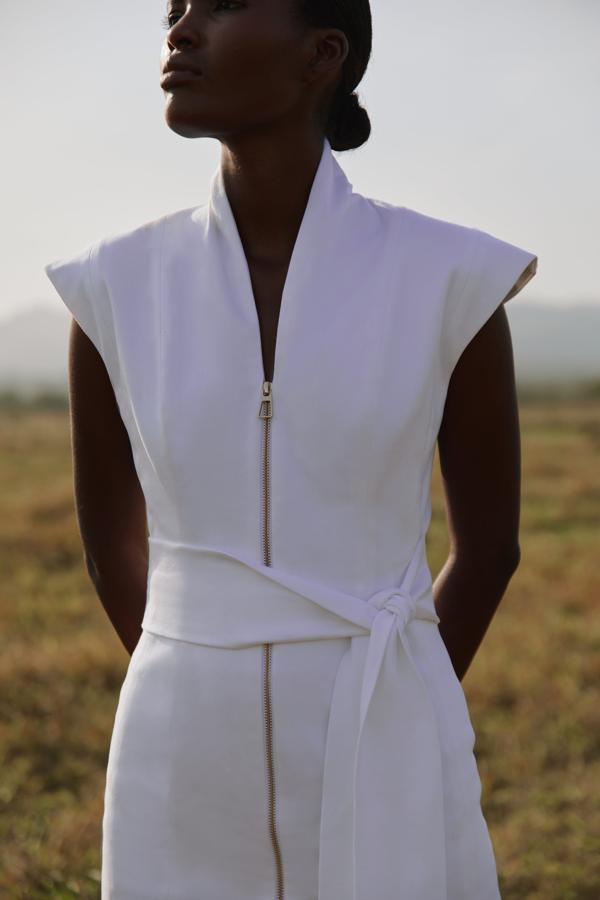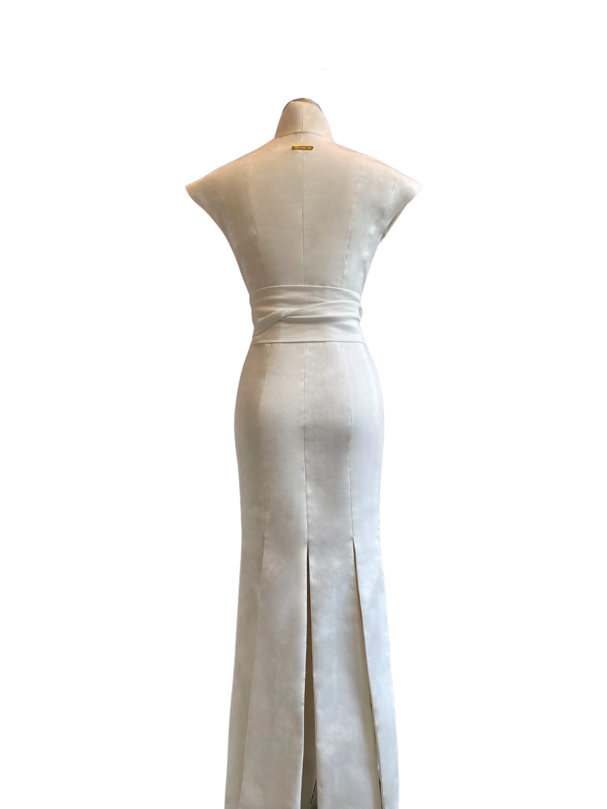 Vestido largo. Entallado a la figura. Cuello con solapa corrida. Elaborado en raso de algodón stretch. Largas tiras dispuestas a modo de tachón abiertos. Cierre metálico al frente con lazada en la cintura.