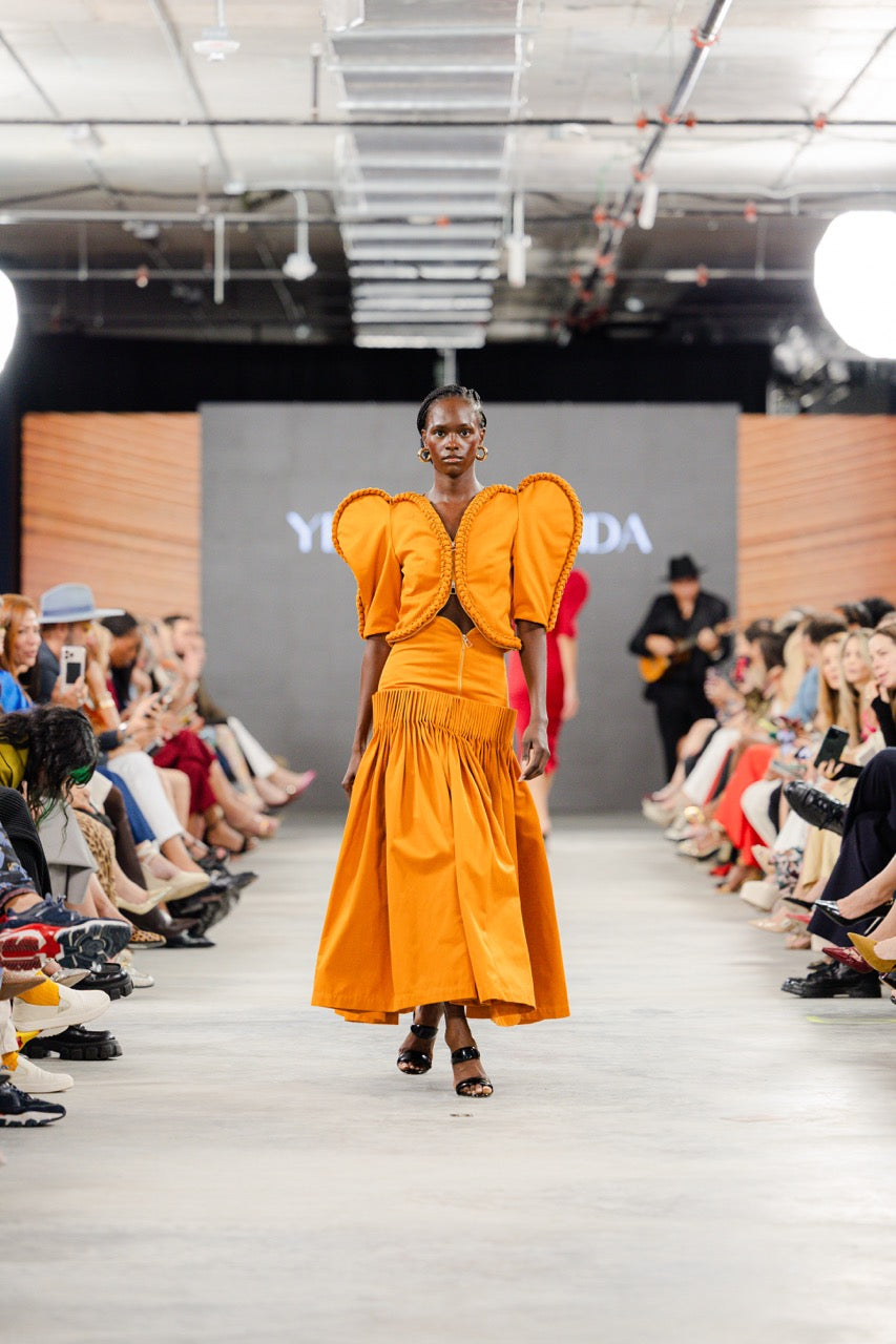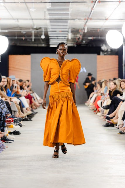 Top corto con escote redondeado y mangas de volumen pronunciado hacia los hombros. Recubierto en macramé elaborado mediante manipulación textil con la misma tela, aplicado cuidadosamente en el contorno del frente y las mangas. Una pieza que celebra el gesto artesanal como ornamento vivo.