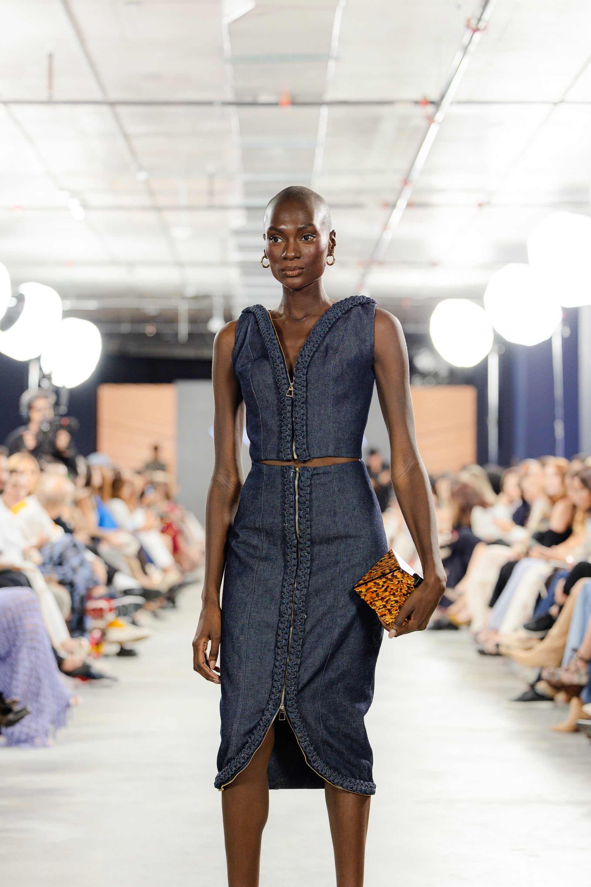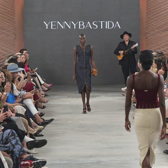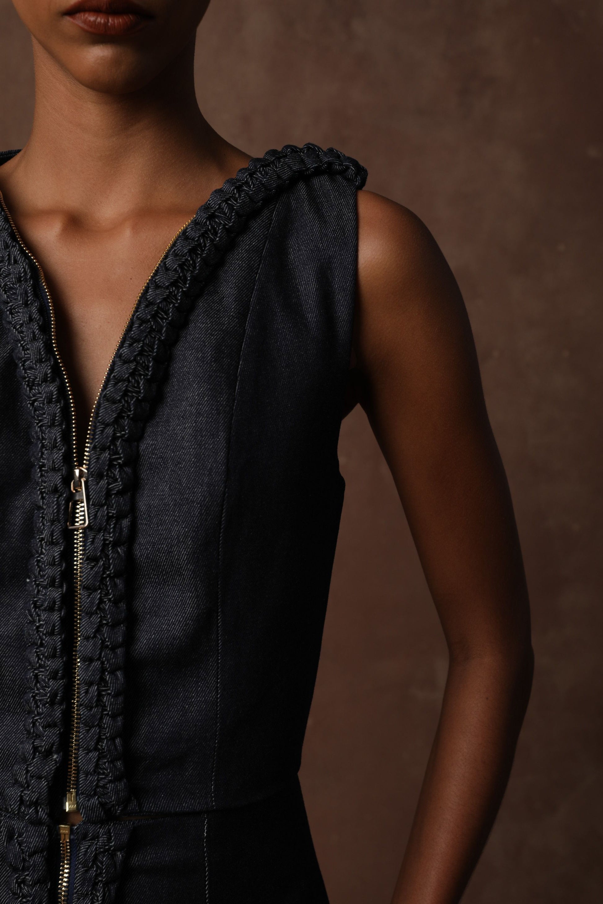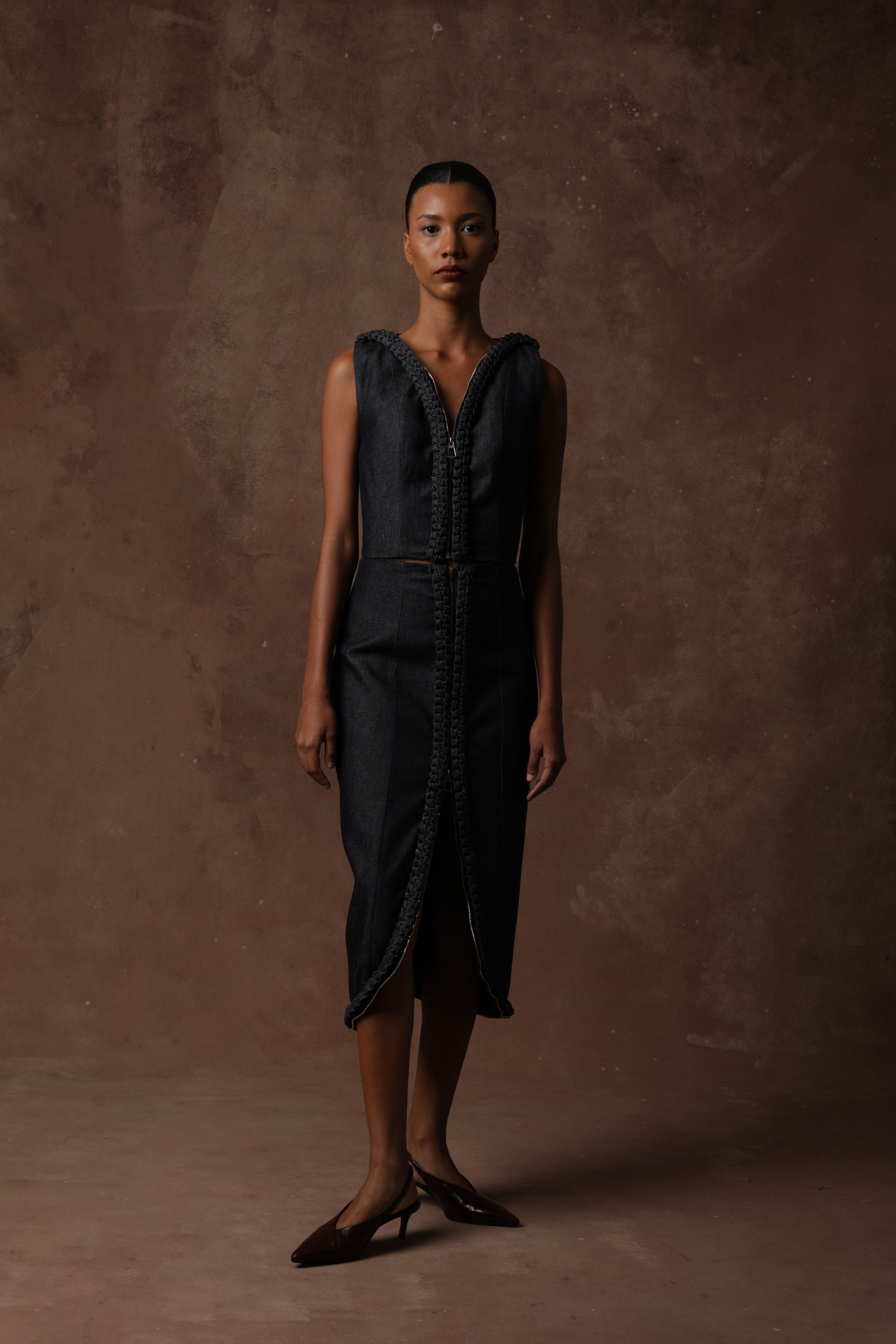 Top corto elaborado en denim cerfirticado, con escote redondeado que se extiende hacia los hombros. El escote delantero está recubierto con un macramé hecho a mano, confeccionado con la misma tela, como gesto de continuidad y contención. Una pieza que honra el trabajo artesanal como forma de memoria.
