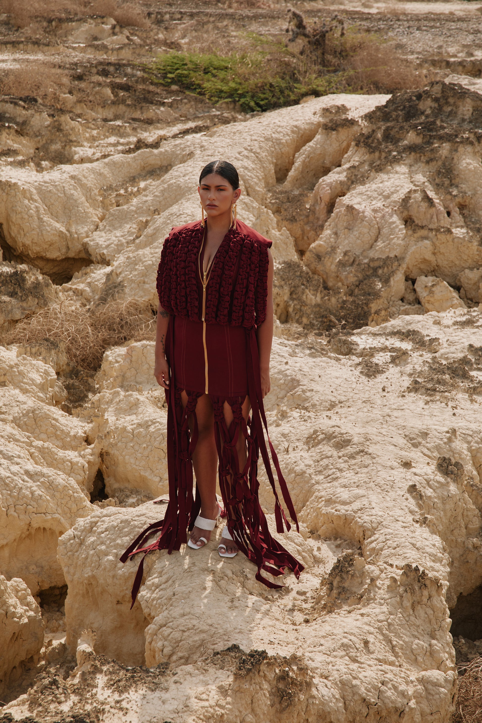 Bomber -type jacket. Made in Drill, v -sleeves. In the front, important fabric of macramé knots handmade.