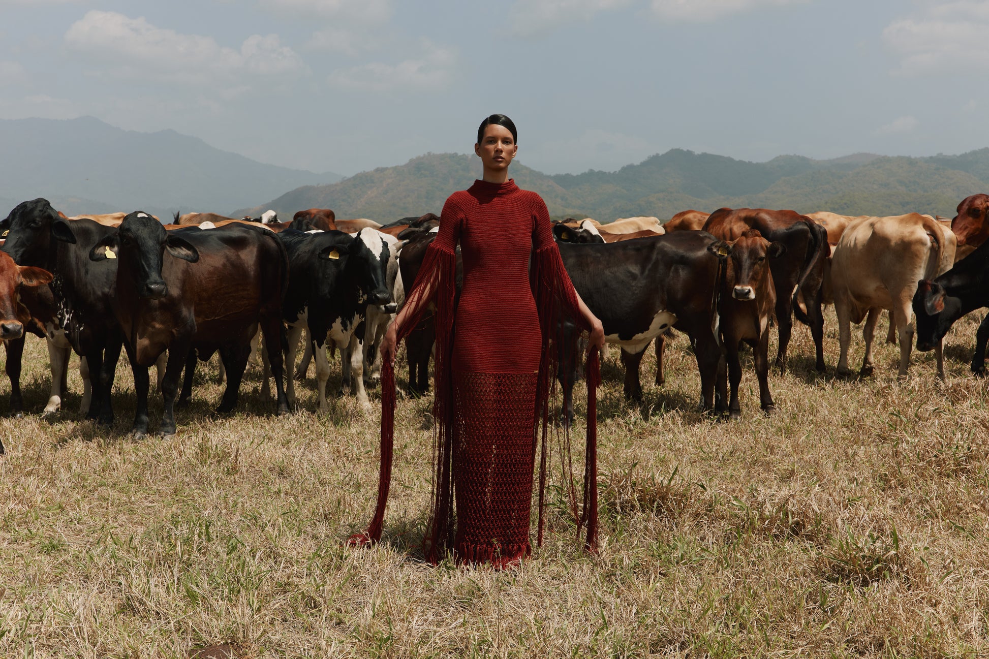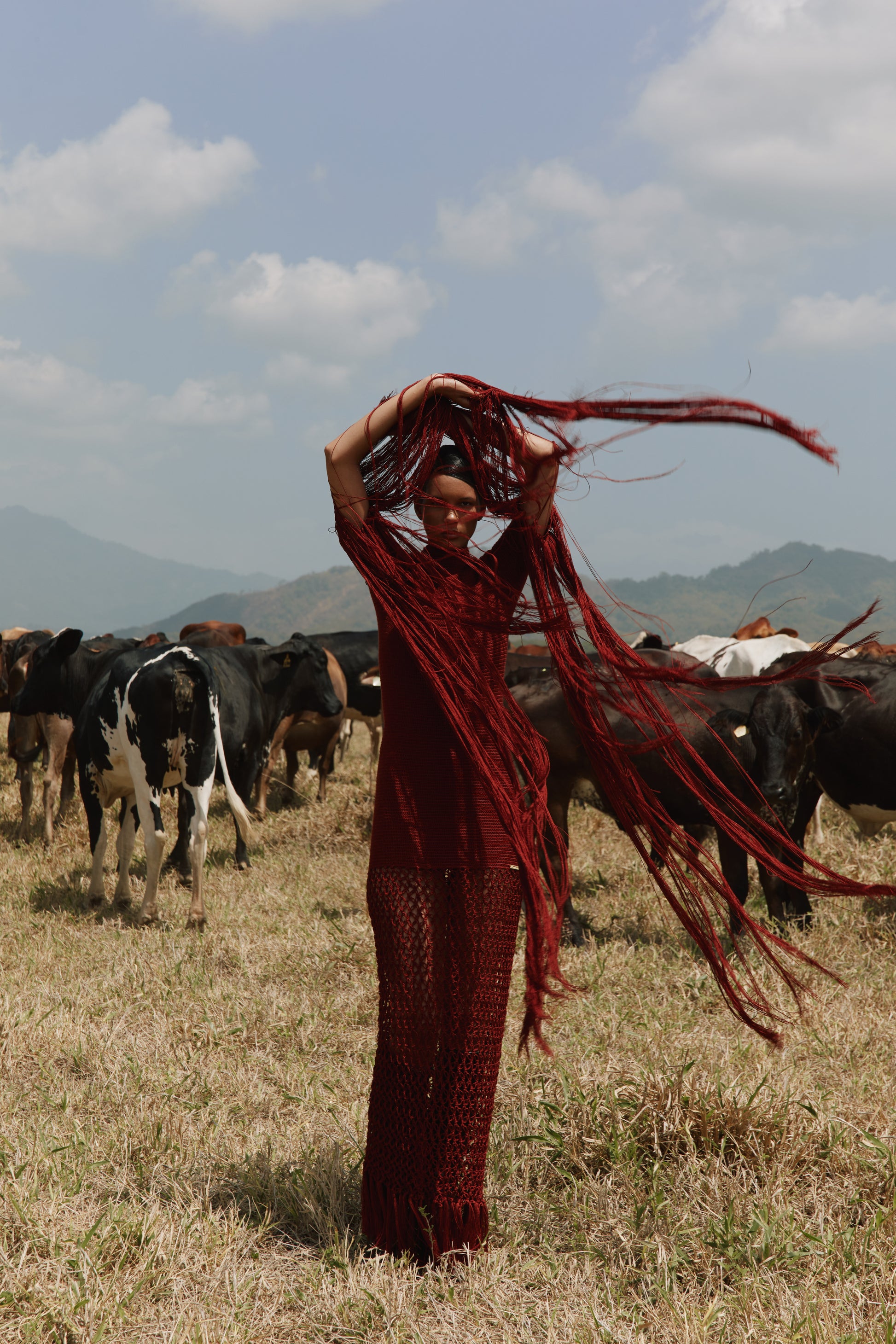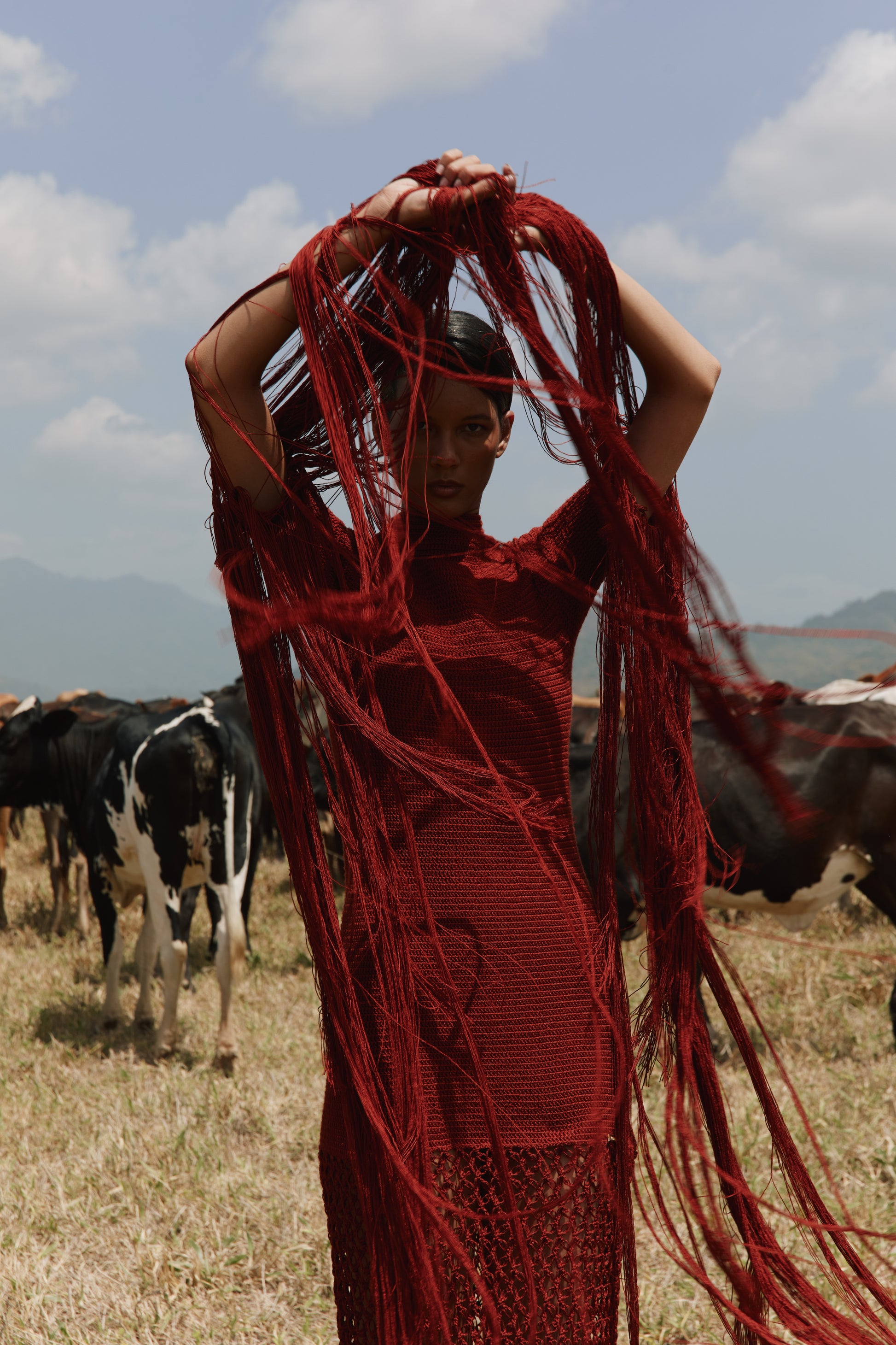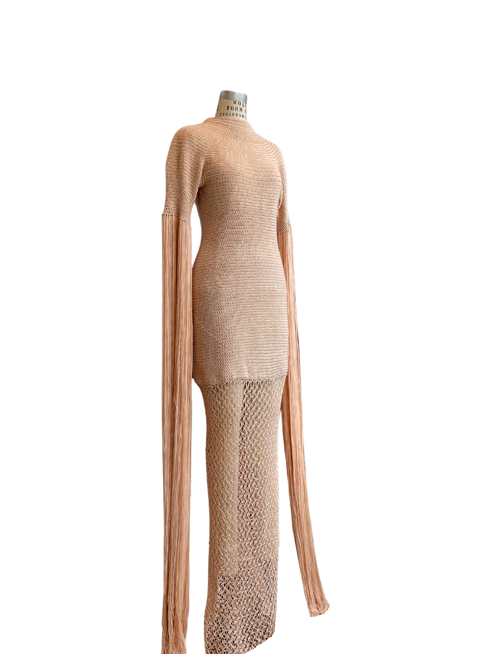 Vestido largo. Tejido a crochet con hilo de algodón. Elaborado con dos técnicas y puntos cruzados. Las mangas son protagonistas. Los largos flecos aportan dramatismo y elegancia. 60 horas de trabajo manual en su elaboración.