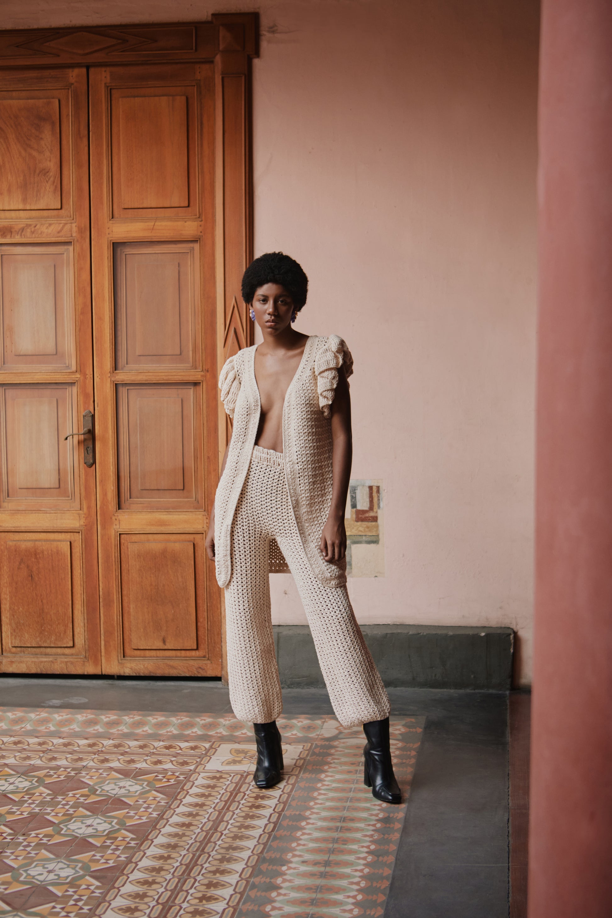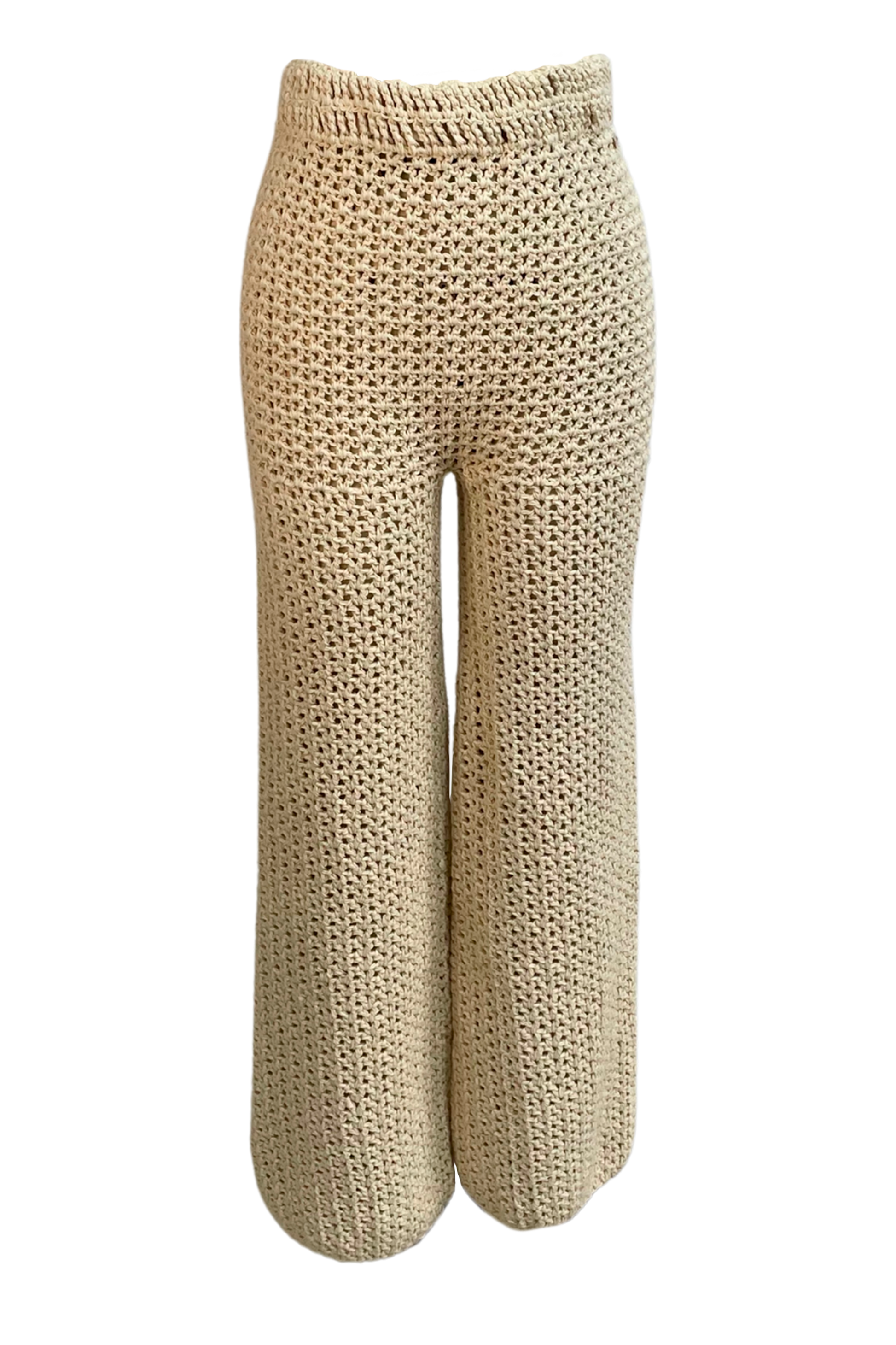 Hand-knitted pants in crochet technique, with rubberized waistband and straight boot.