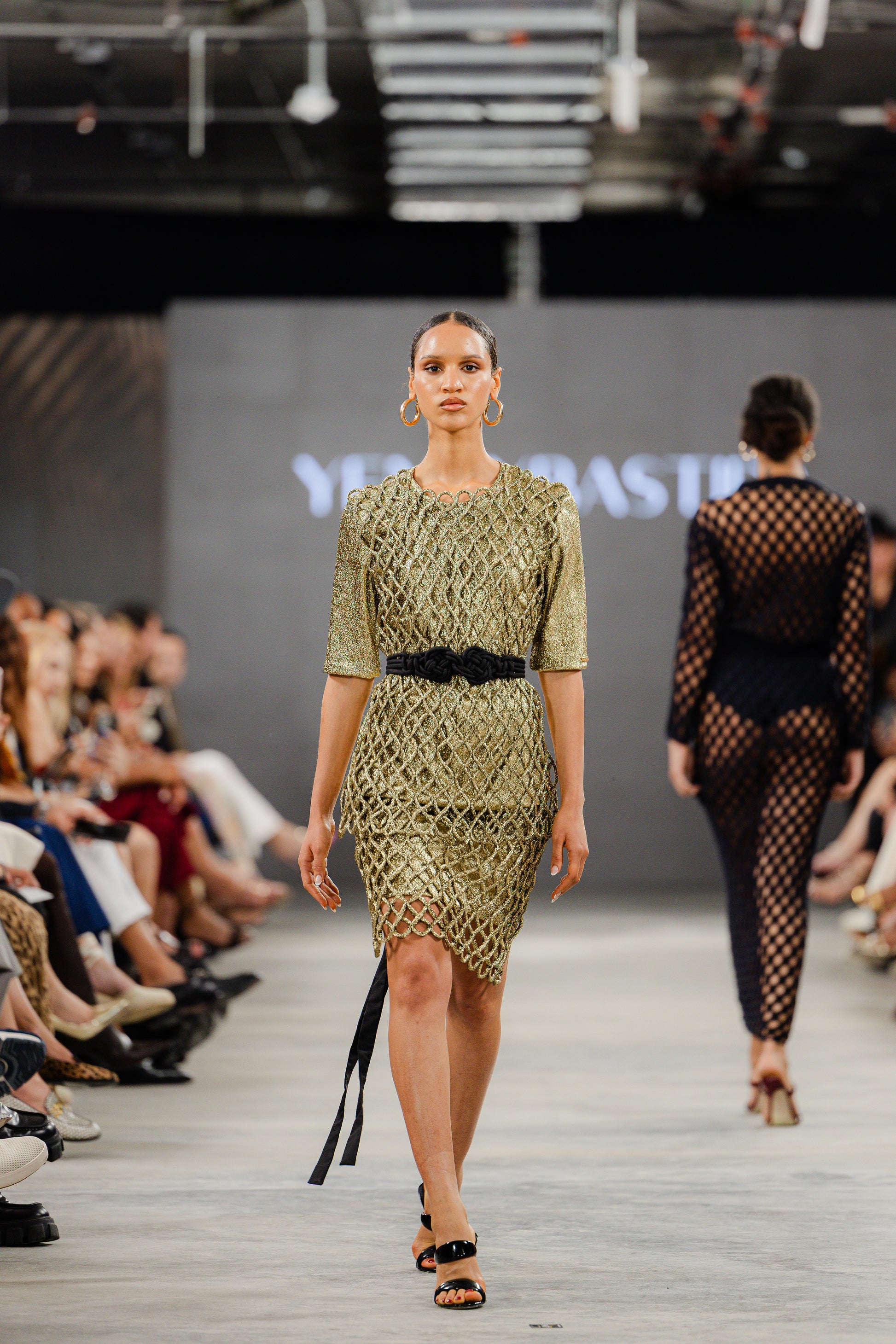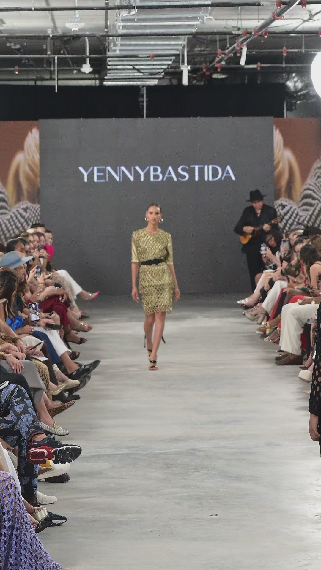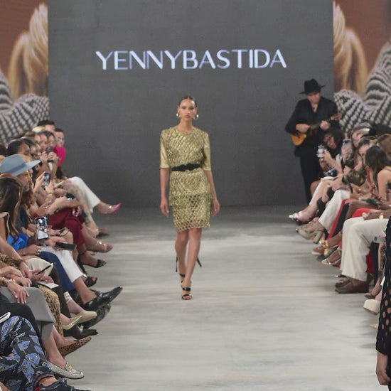 Falda corta, elaborada en tela deadstock de LVMH con hilos de Lurex. Intervenida mediante un trabajo de manipulación textil completamente hecho a mano, con tiras entrelazadas en un tramado especial que dialoga con la Blusa El Dorado. Una pieza que honra la minuciosidad como forma de resistencia y lujo ritual.