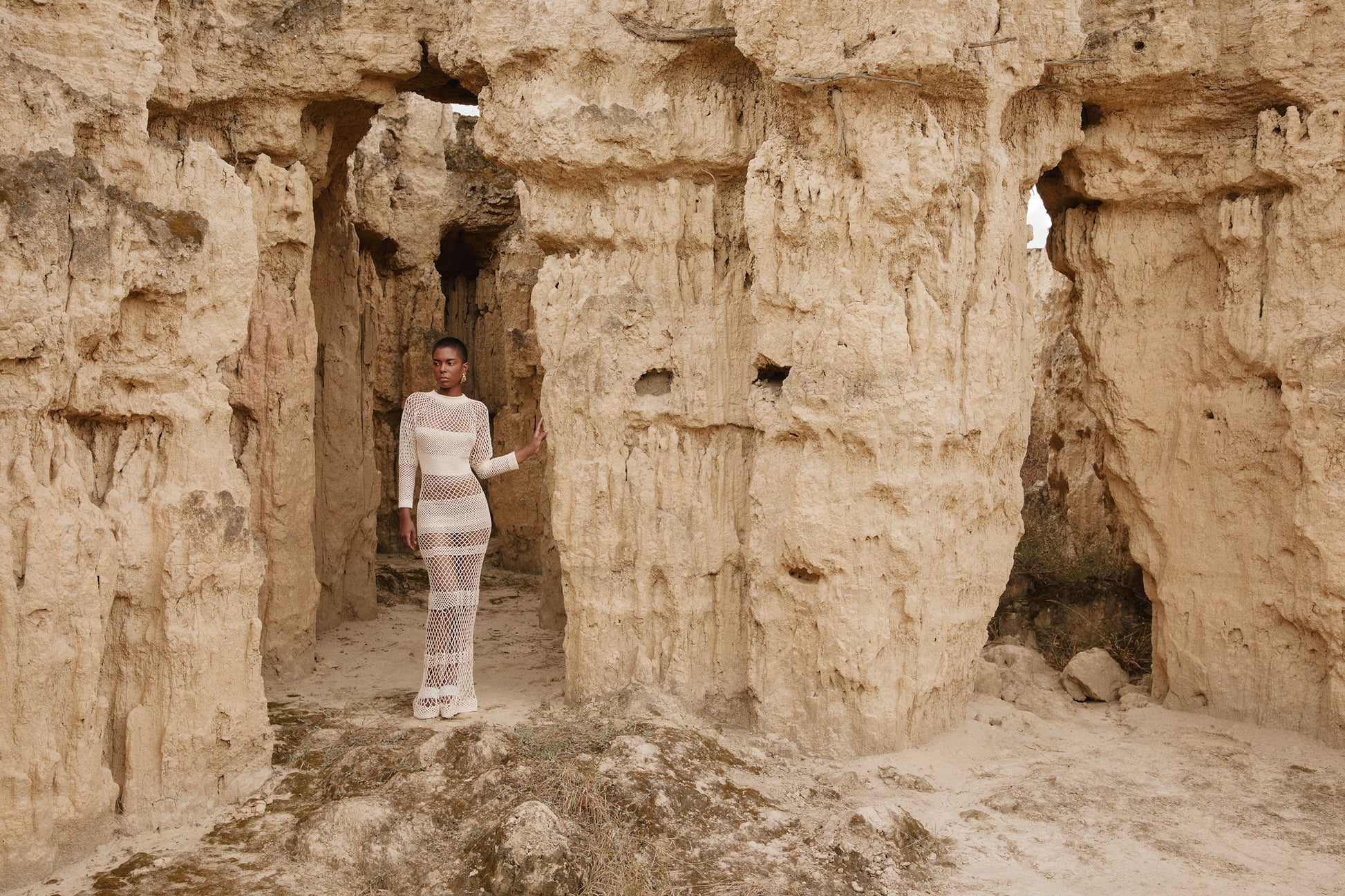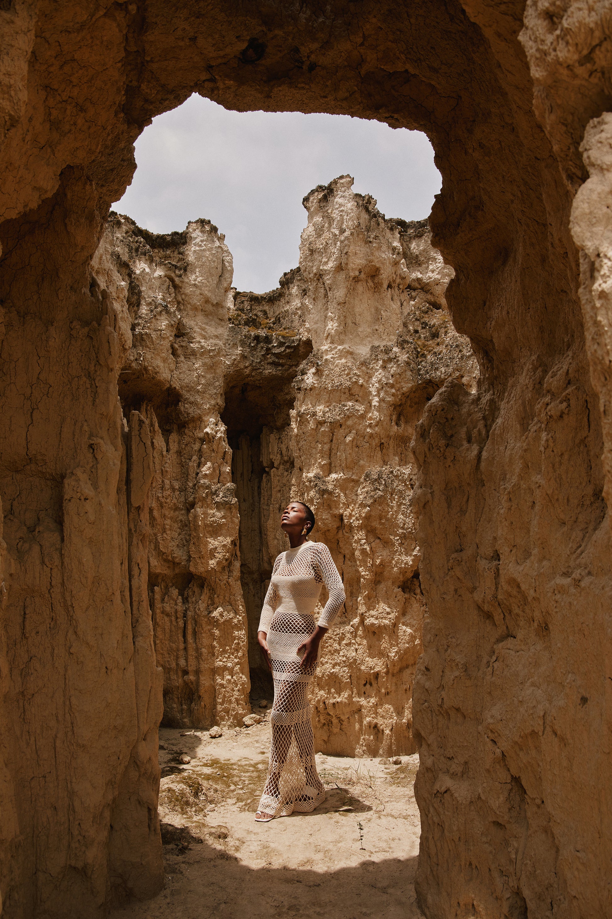 Vestido entallado a la figura, largo y de mangas largas. Tejido a crochet en una sucesión de tramas de diversos calados que lo hace muy liviano. Confeccionado con una sola hebra de algodón orgánico que envuelve la silueta.