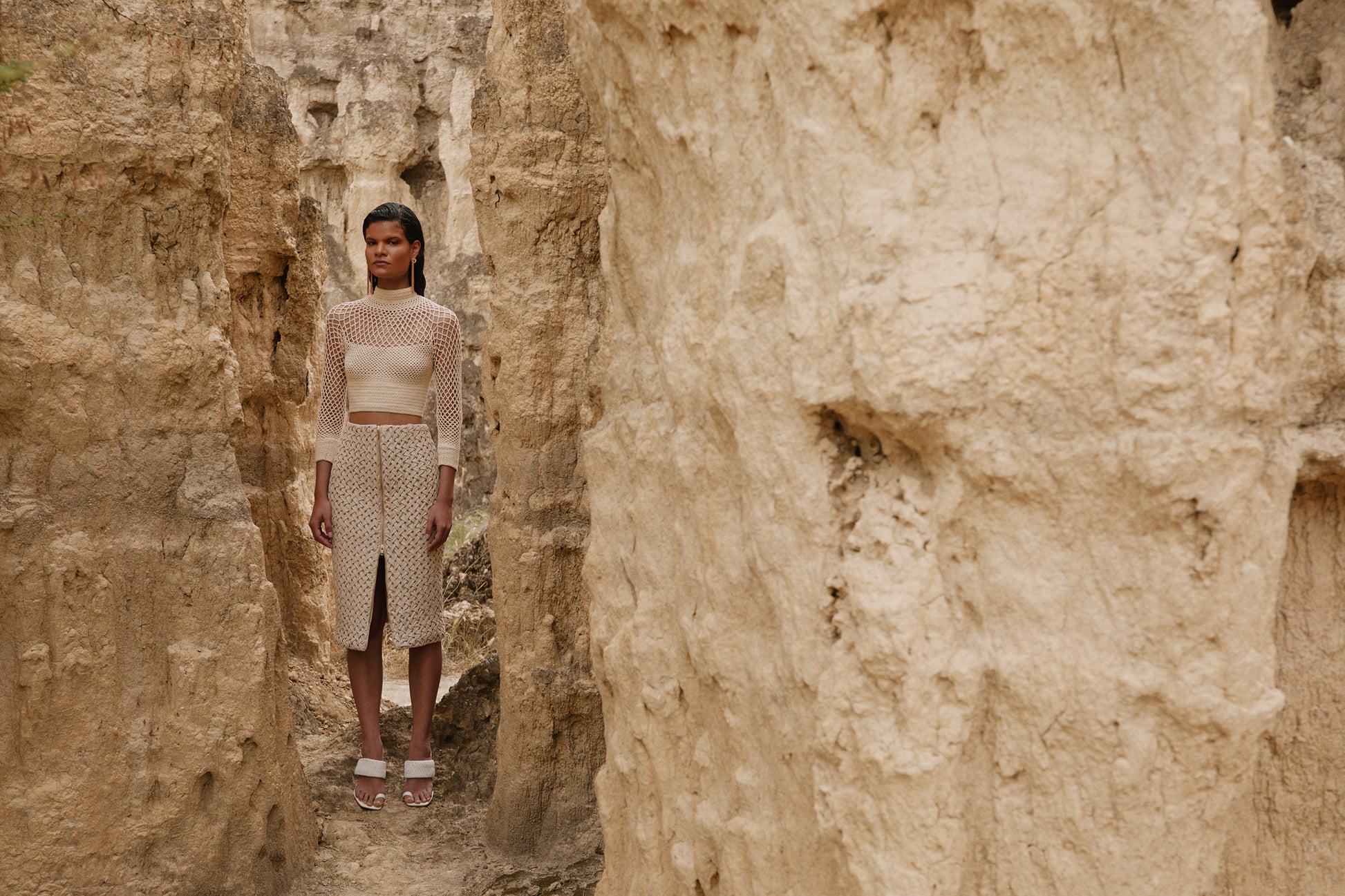Top corto de manga larga y cuello alto. Tejido a mano en técnica de crochet con algodón orgánico. Aproximadamente 50 horas de trabajo manual.