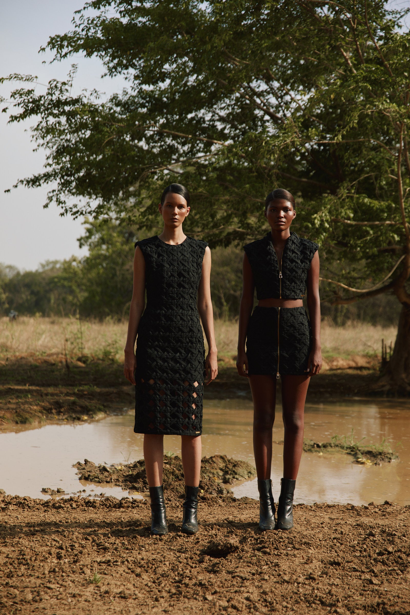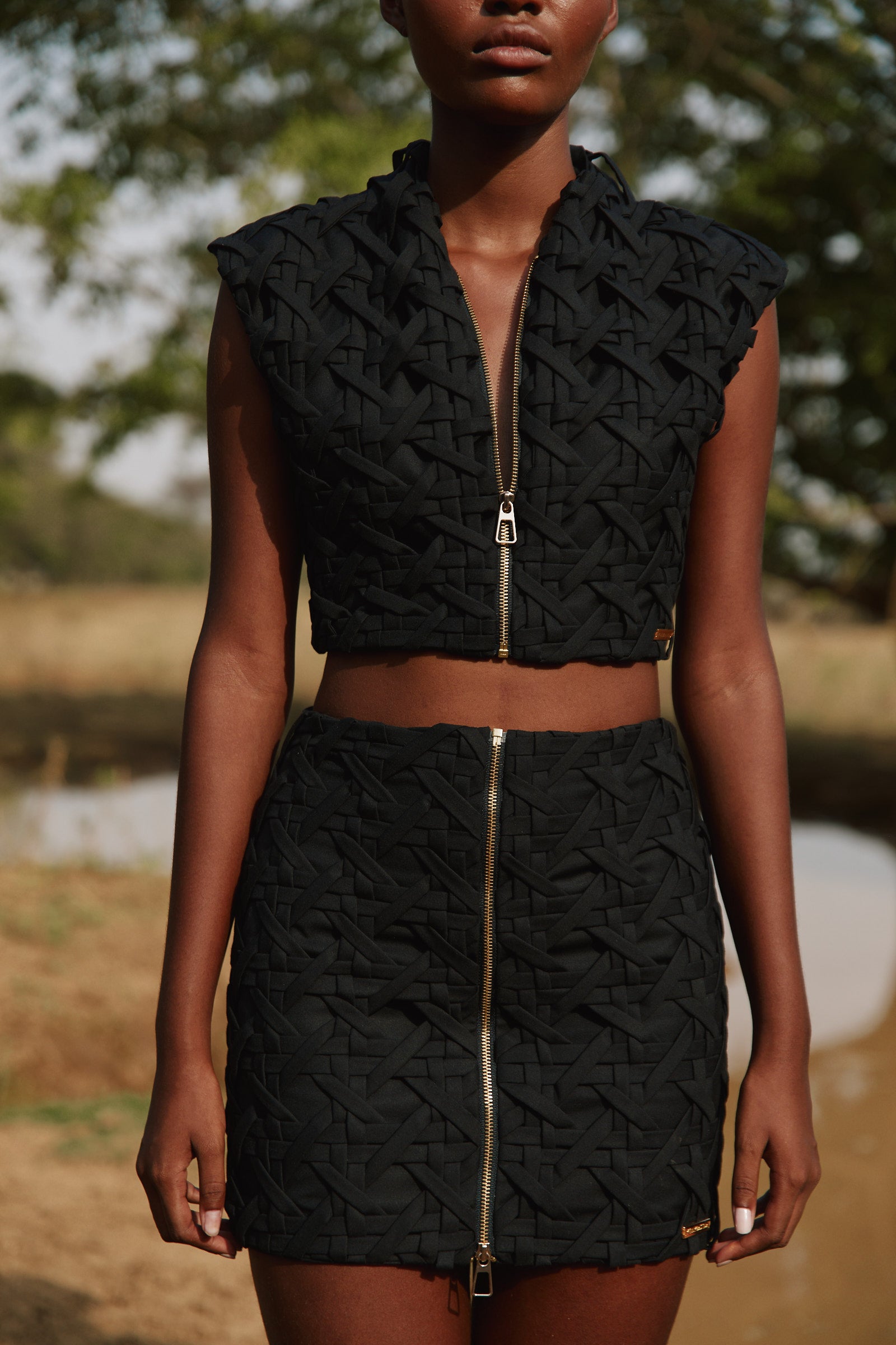 Falda corta entallada. Elaborada en gabardina italiana. Recubierta con fina técnica de cintas elaboradas a mano con la misma tela. Cierre metálico al frente. 32 horas de trabajo manual en su elaboración.