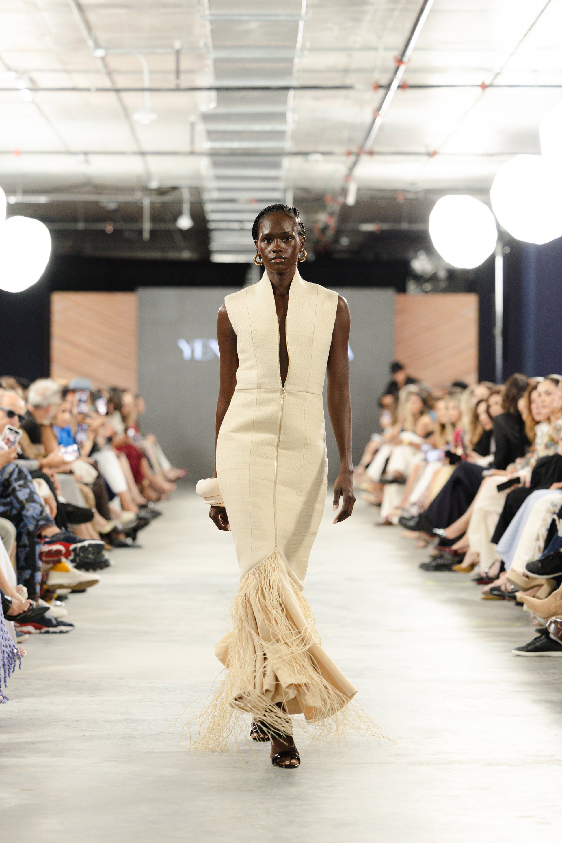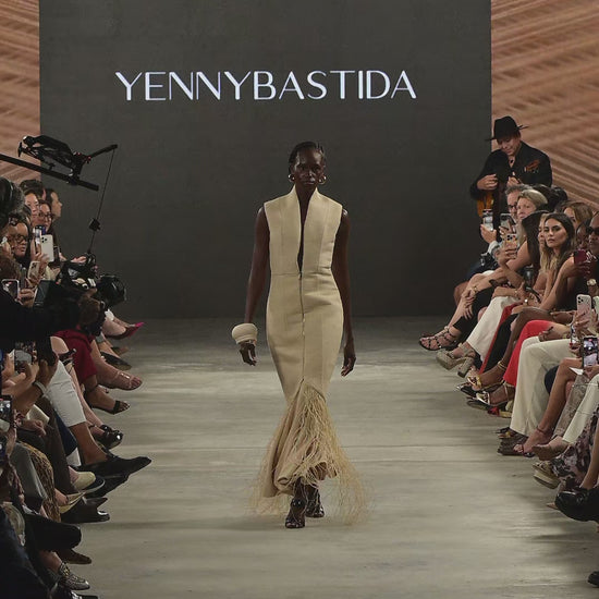 Falda entallada a la figura con doble fondo y caída fluida tipo sirena, que aporta amplitud y movimiento. Elaborada en textil italiano, esta pieza transforma la estructura en gesto danzante, evocando el cuerpo como territorio ritual.