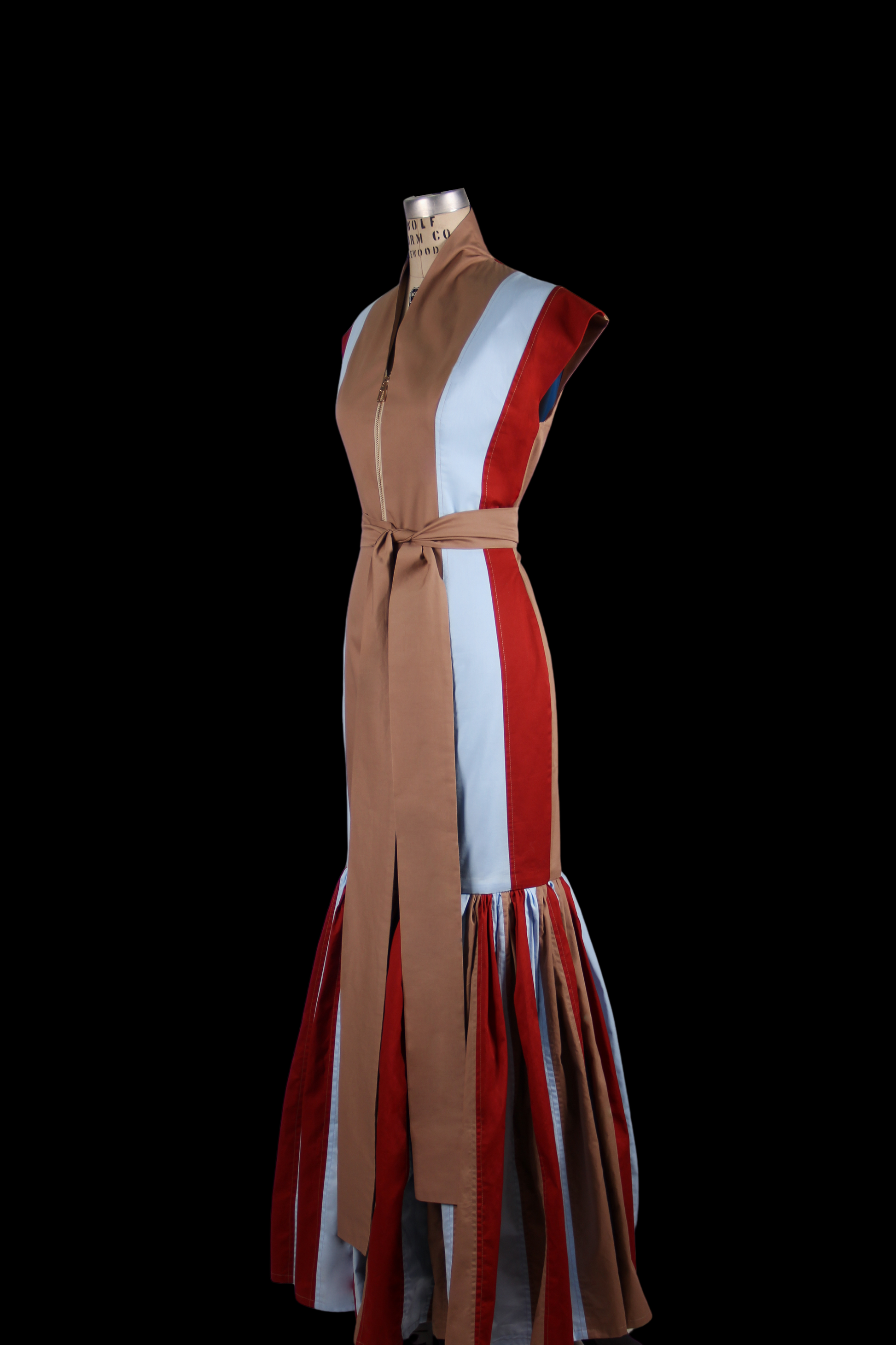 Vestido largo. Silueta de corte entallado con solapa corrida. Profusa falda abullonada al final. Elaborado en raso de algodón de tres colores. Cierre metálico al frente.