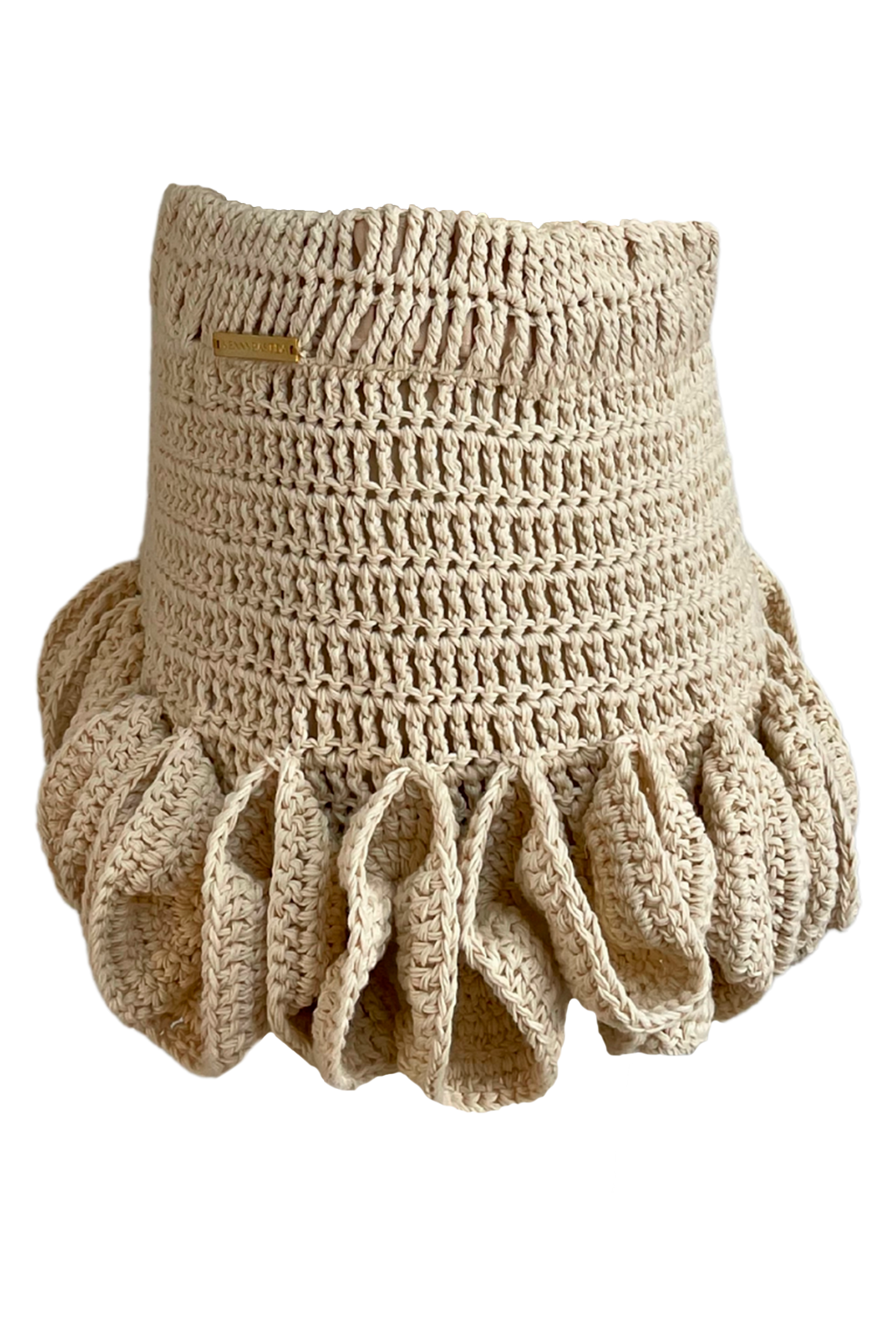 Hand-knitted mini skirt in crochet technique, rubberized waistband and ruffles.