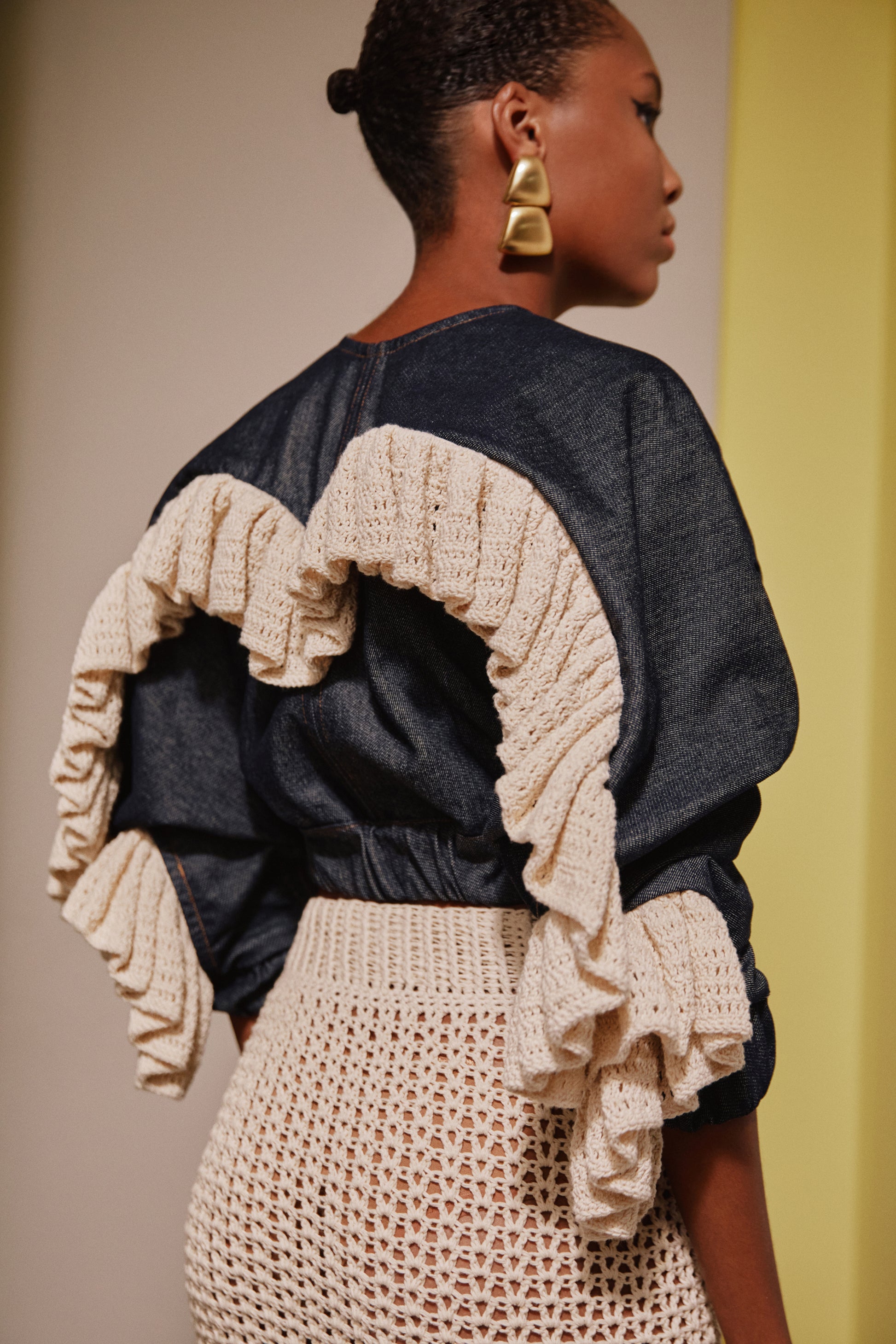 Short jacket with long sleeves made of Jean made in Venezuela faralado on the back.