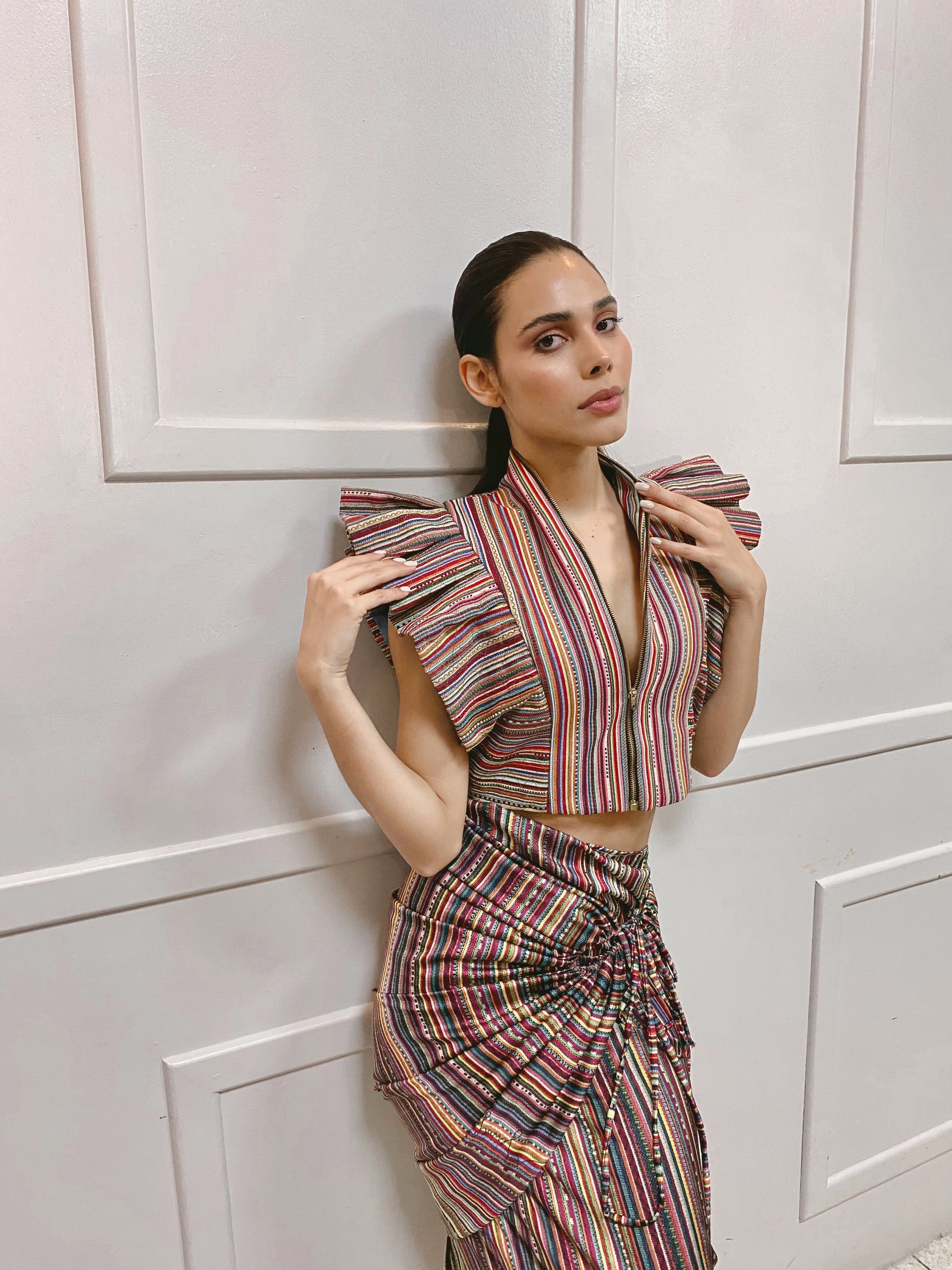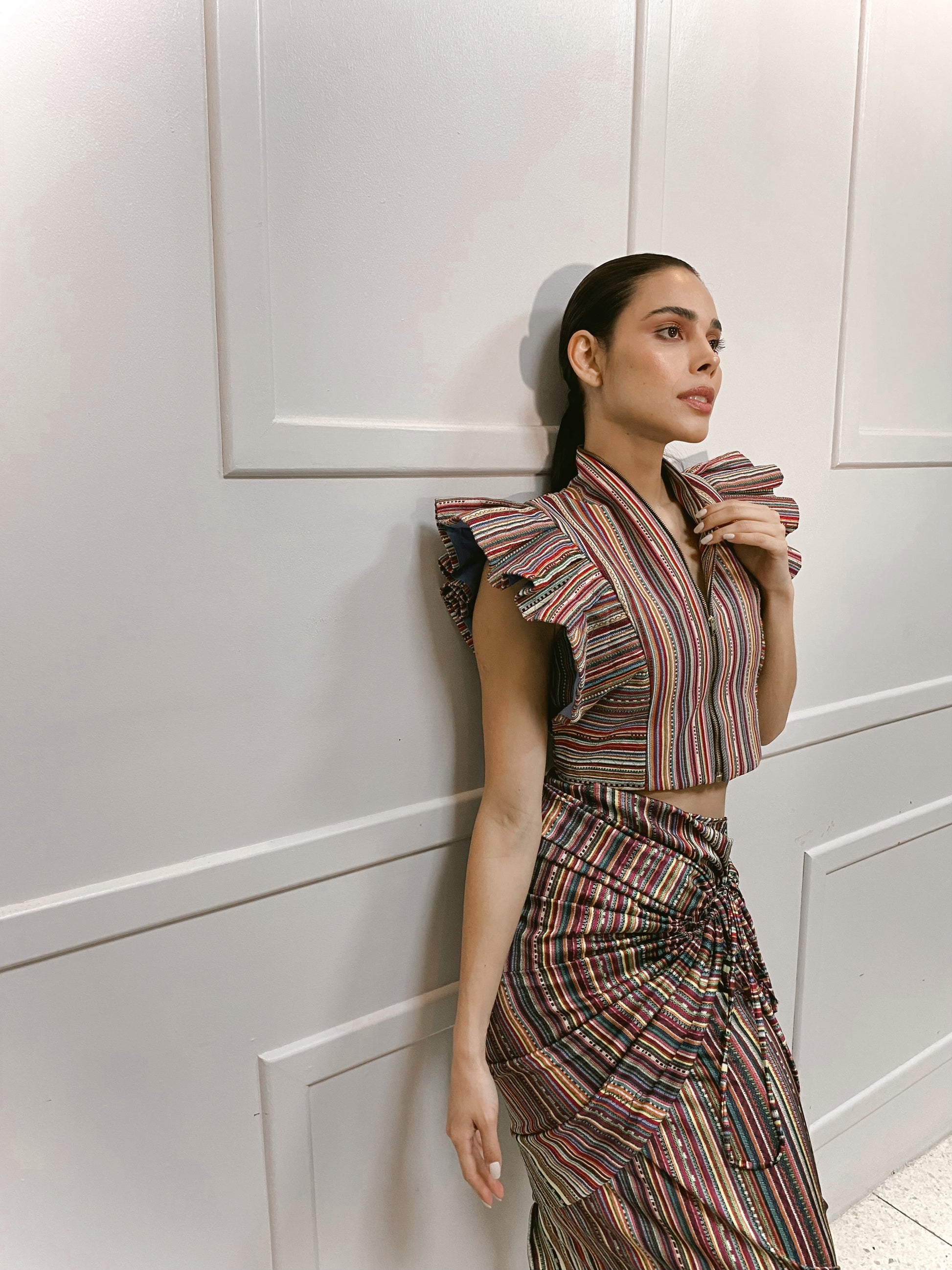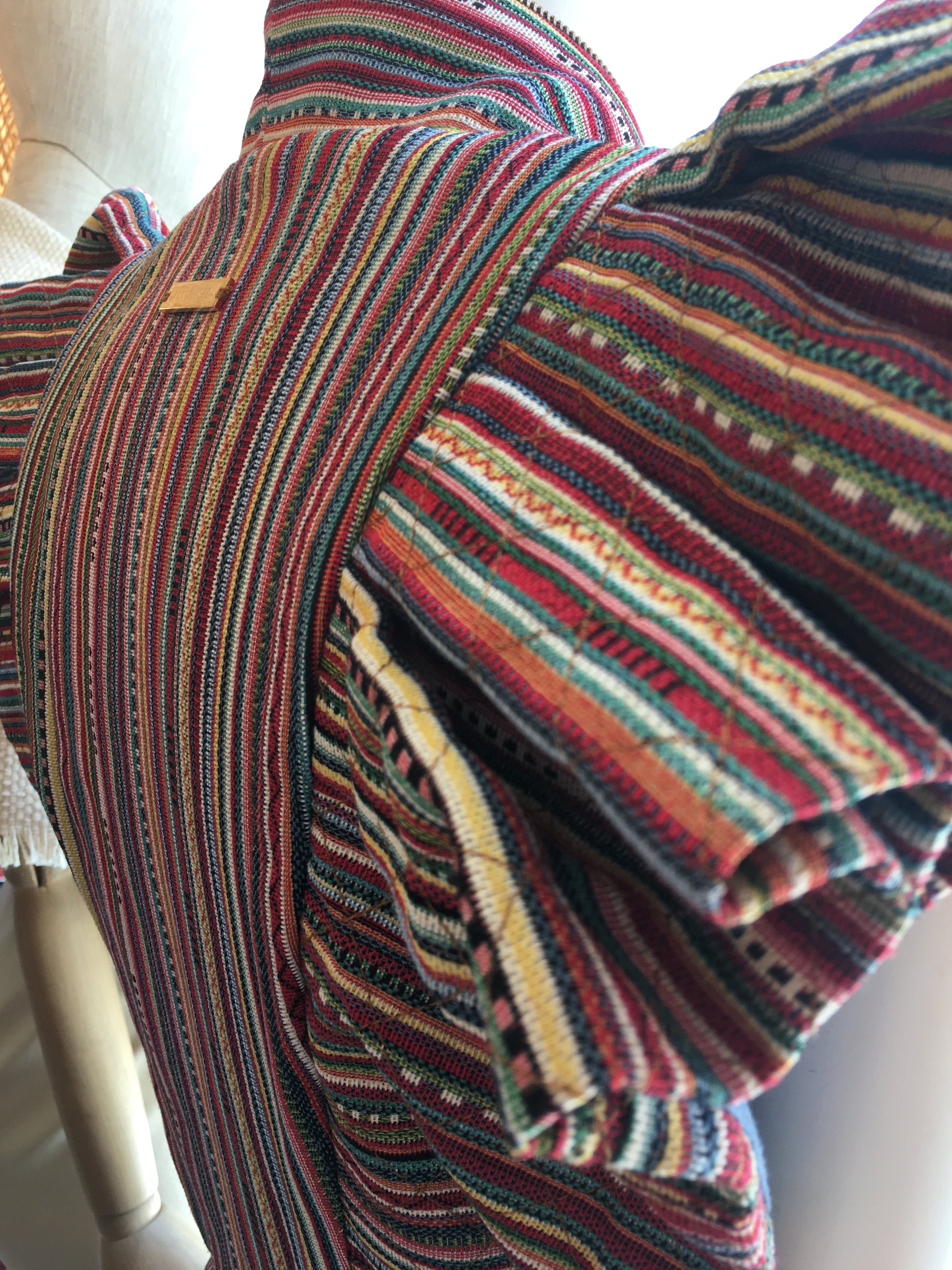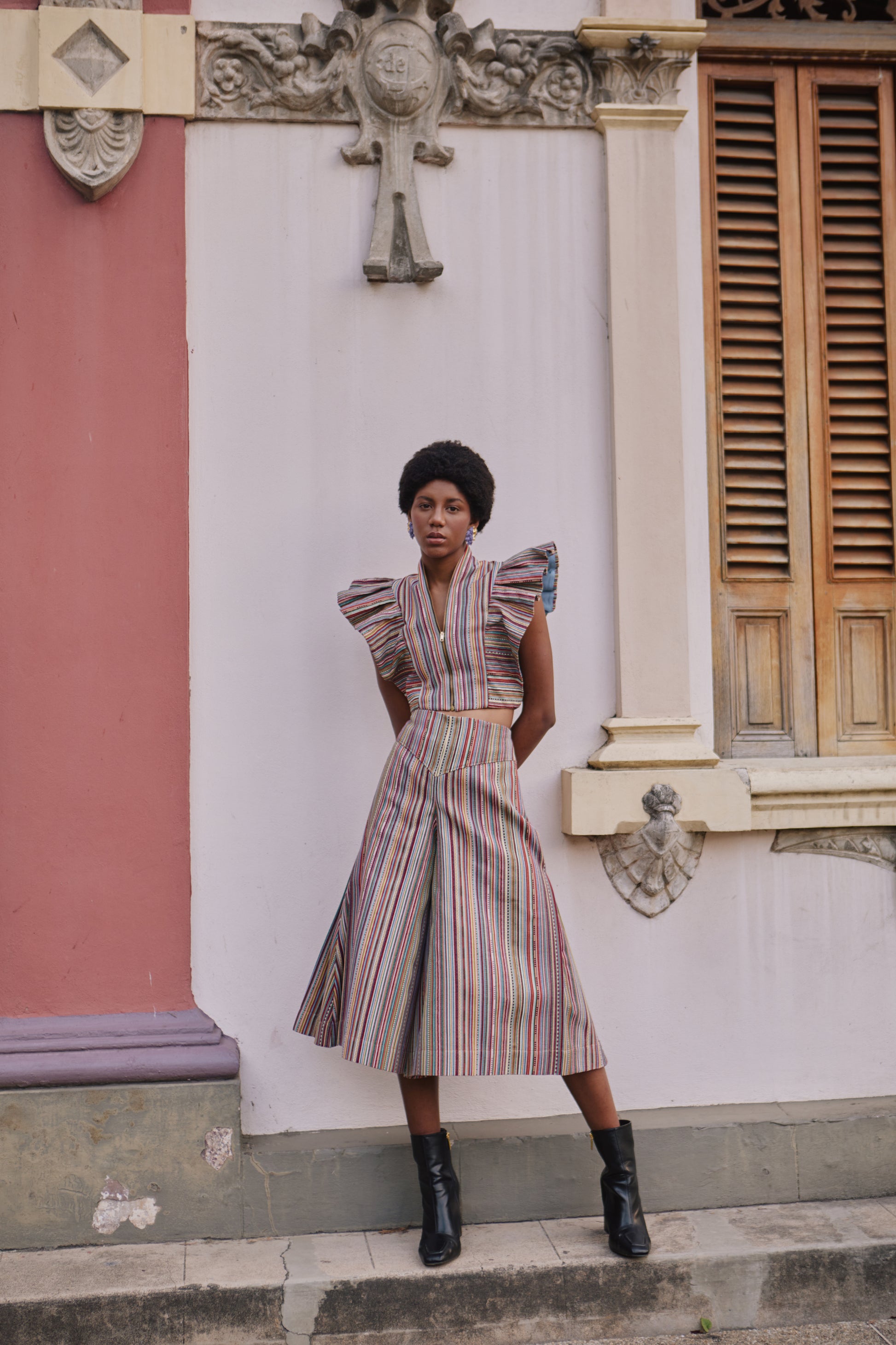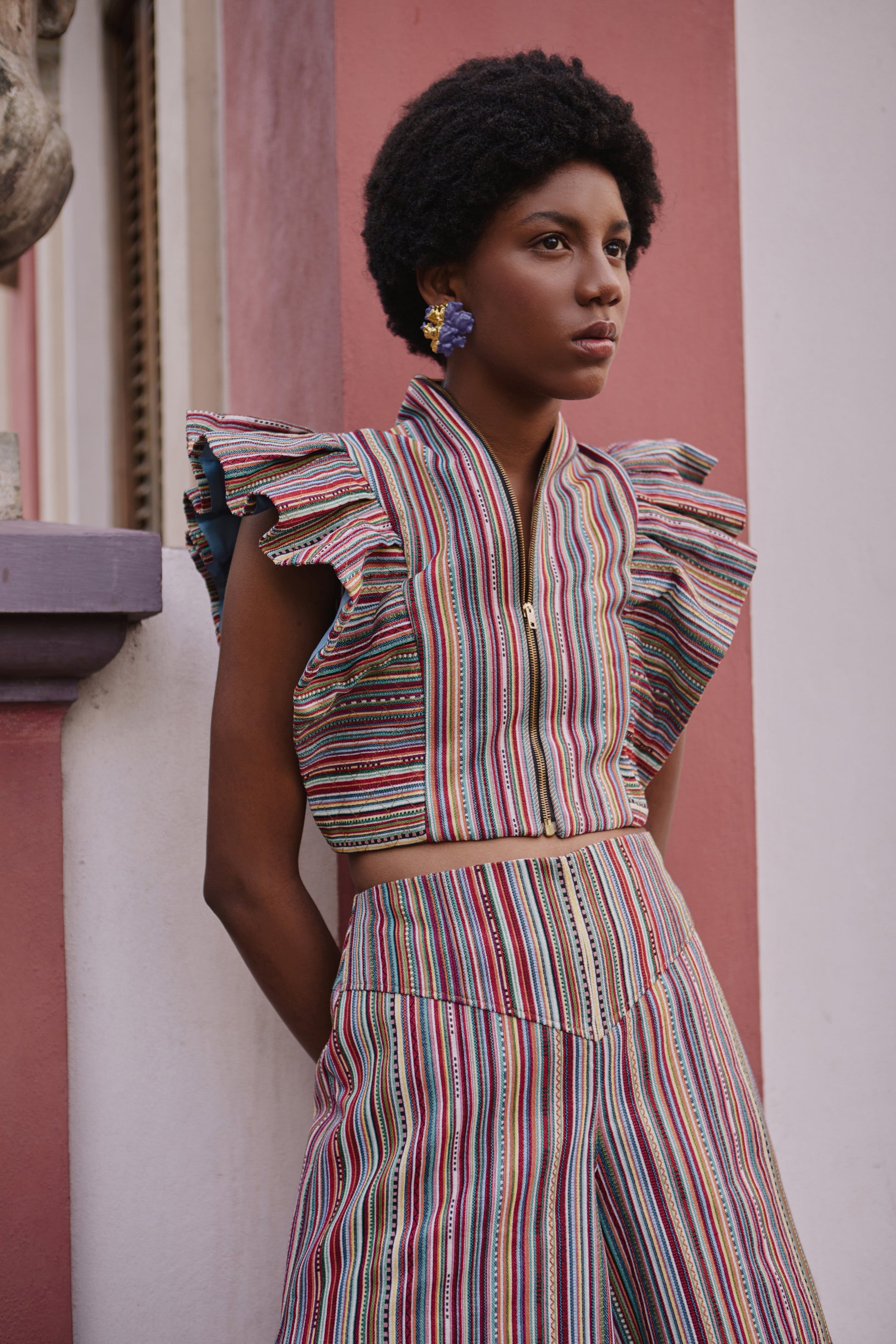 Top vest made of striped canvas, high pleats on the shoulders and zipper around the neck.
