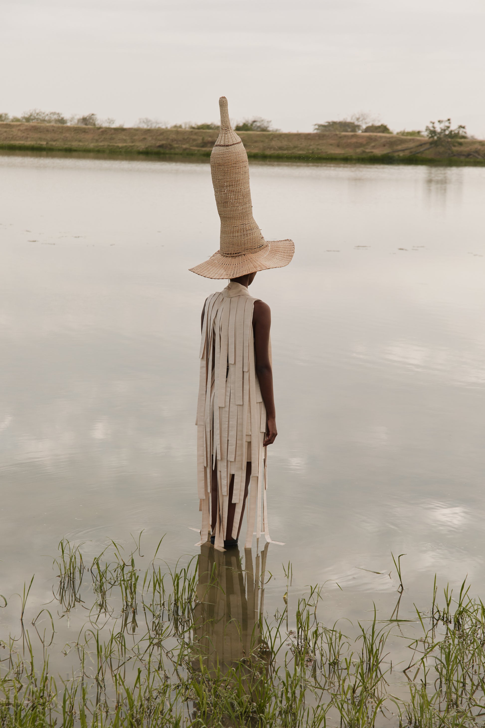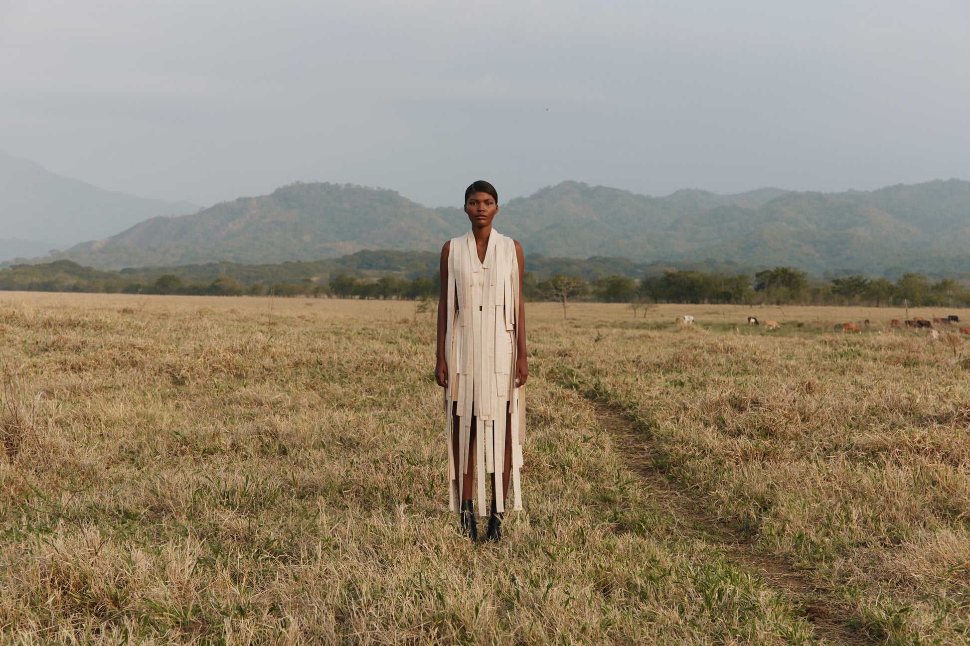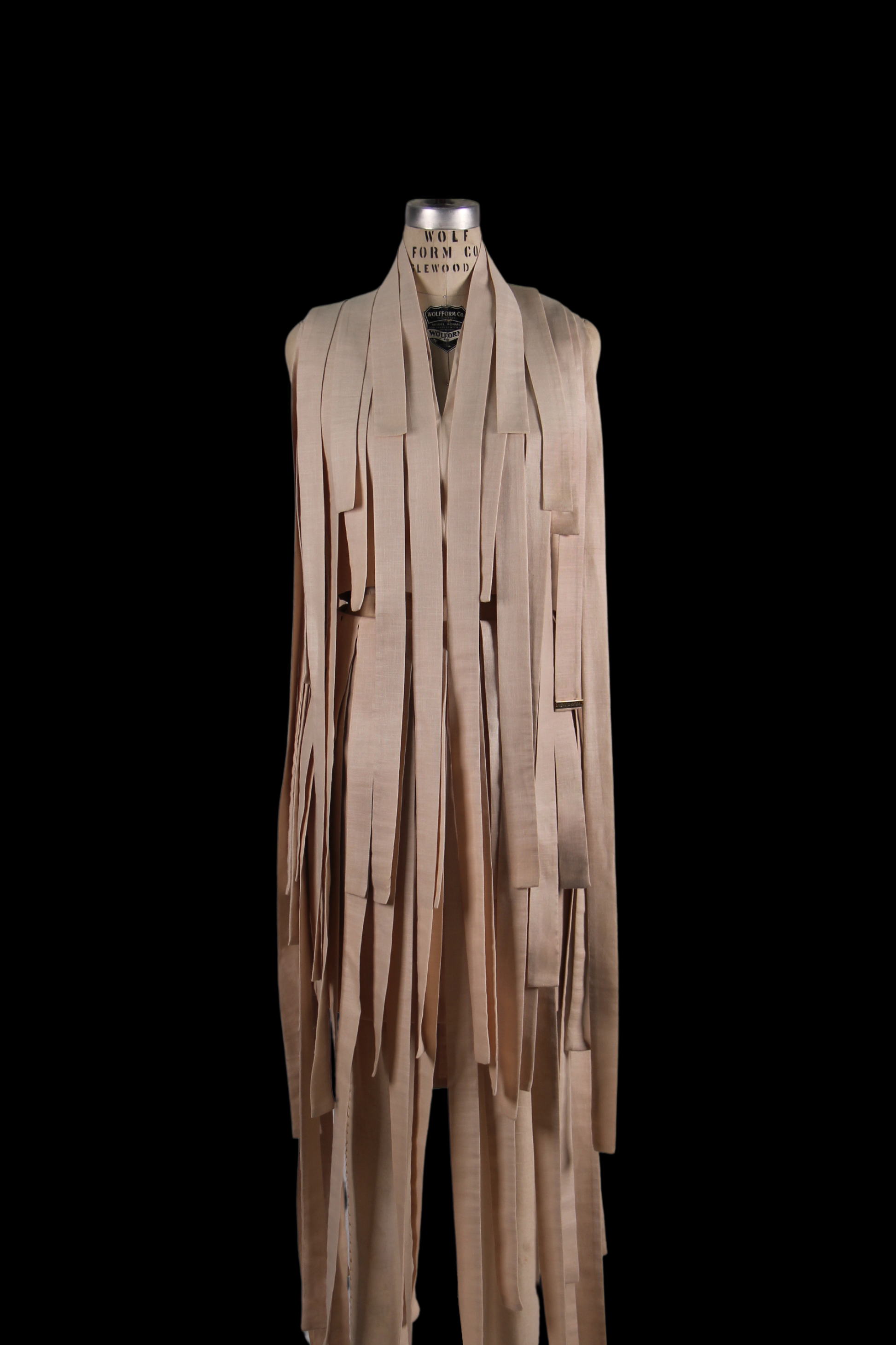 Falda corta de base. Elaborada en lino. Recubierta con tiras de la misma tela a modo de flecos en diferentes tamaños.