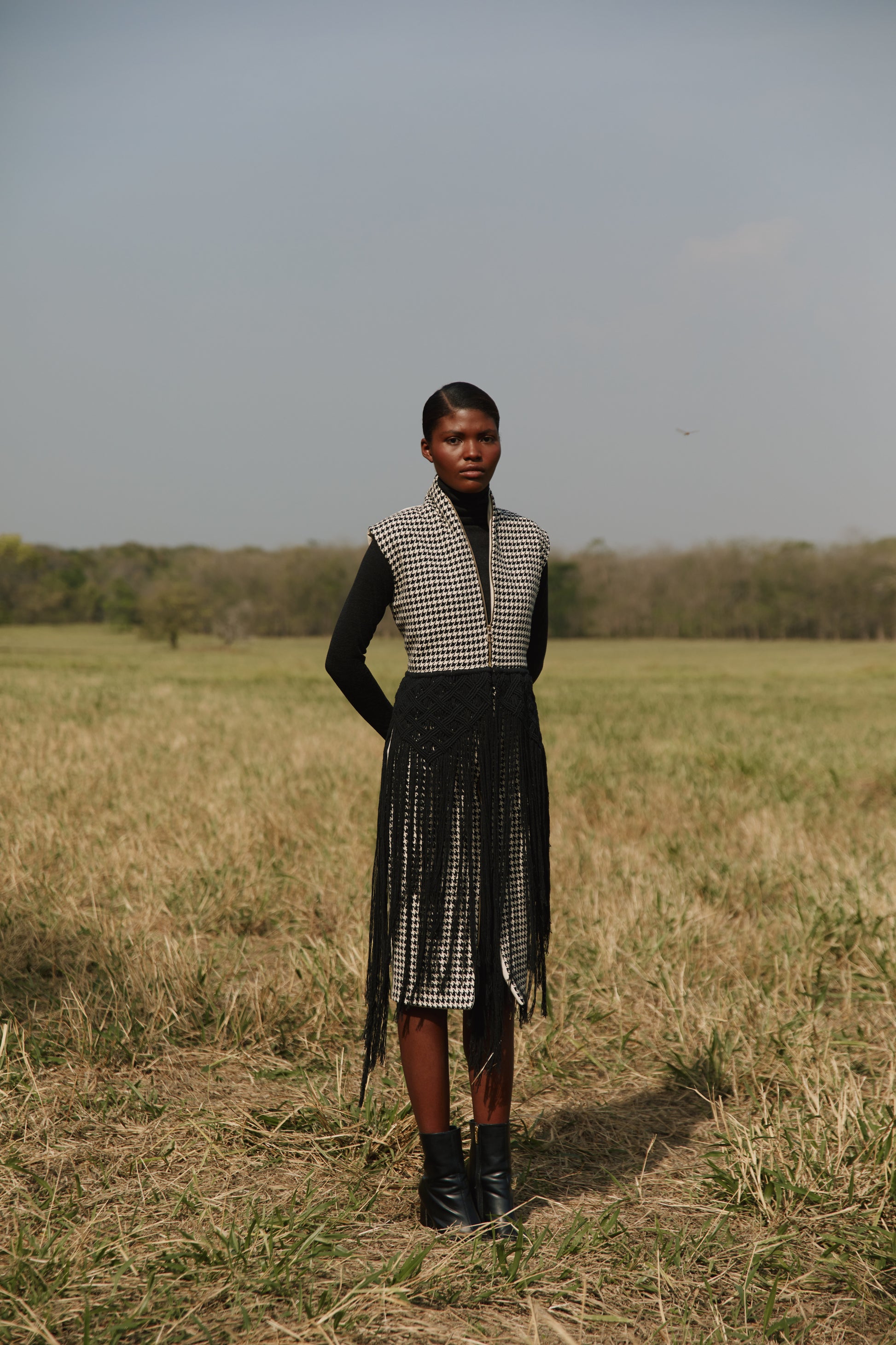 Chaleco statement Yenny Bastida. Re-diseño del exitoso chaleco de Hamaca. Elaborado en telar artesanal con diseño de pata de gallo. Base de dril crudo certificado. Destacan elementos realizados en macramé y largos flecos. Cierre metálico al frente.