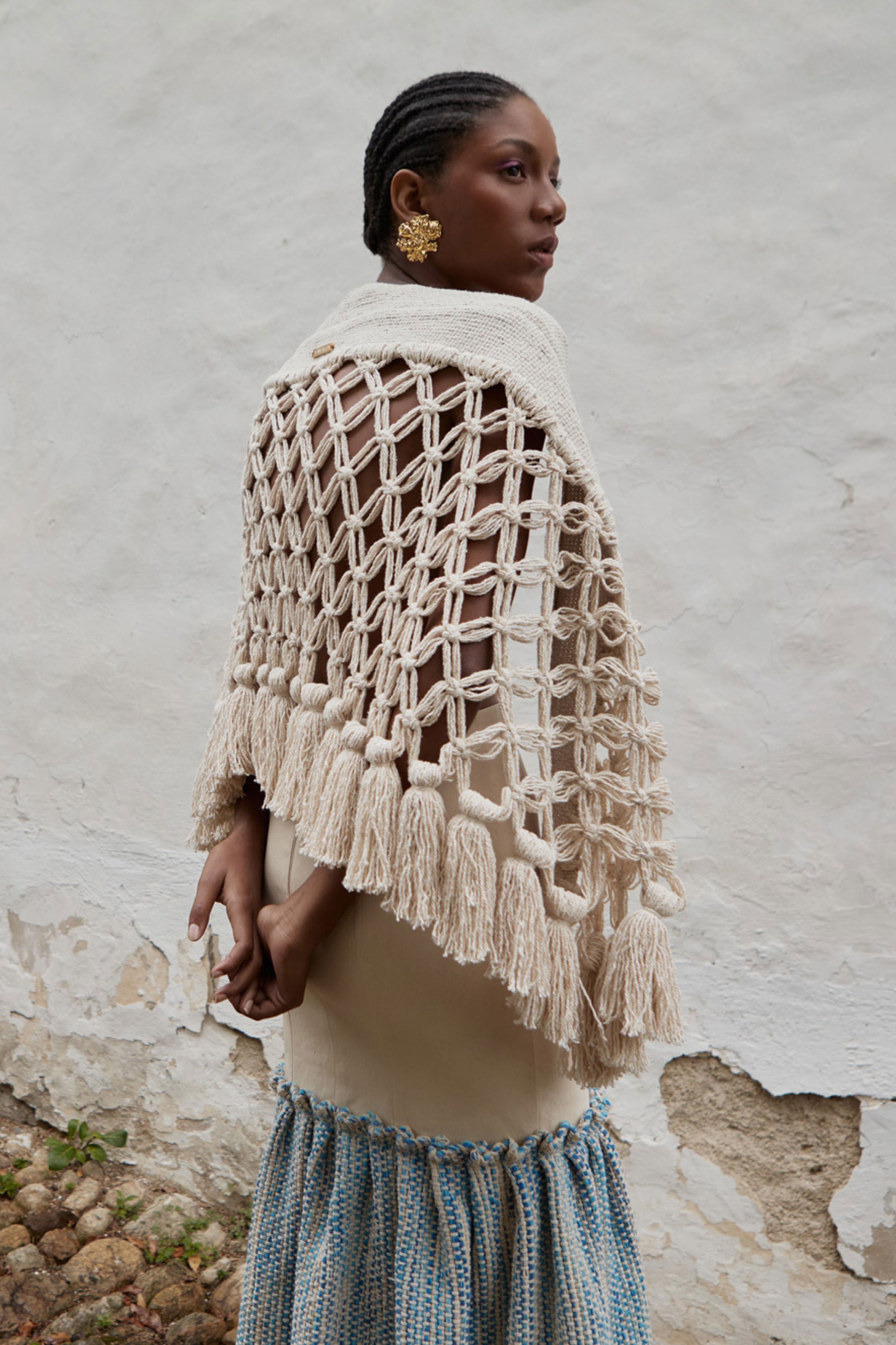 Handmade poncho, artisan fabric with macrame knots and wooden buttons.