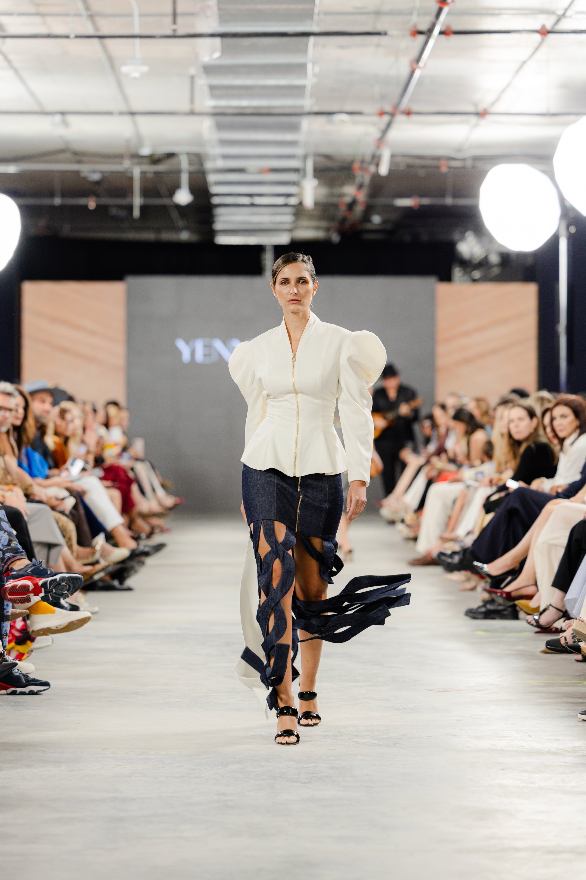 Blusa blanca de manga larga con hombros untuosos y cierre frontal. Desde la cintura hacia abajo, presenta un corte tipo peplum que aporta soltura y movimiento. Incluye tirantes para amarrar, permitiendo ajustar la silueta con un gesto envolvente. Una pieza que combina estructura y fluidez en equilibrio.
