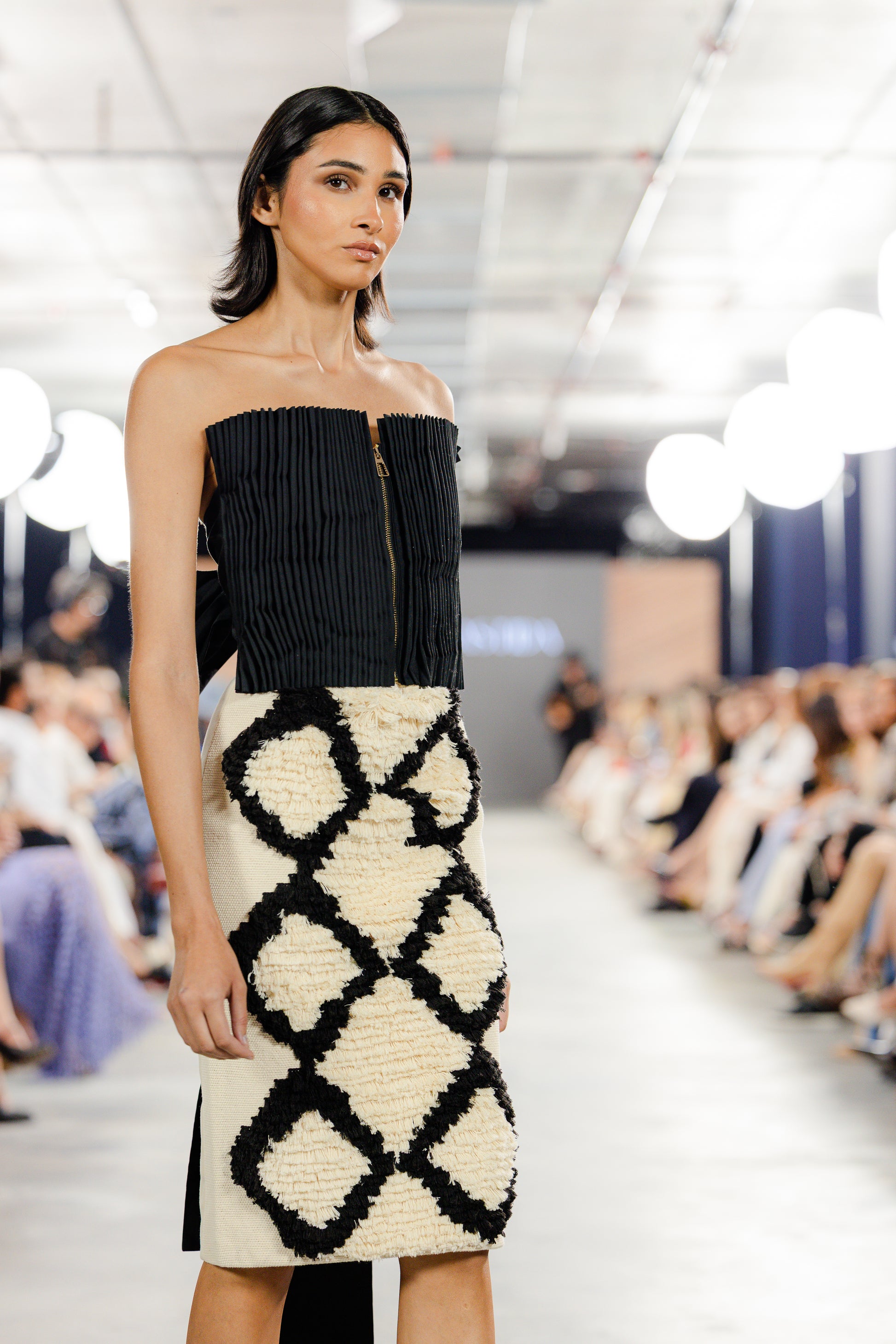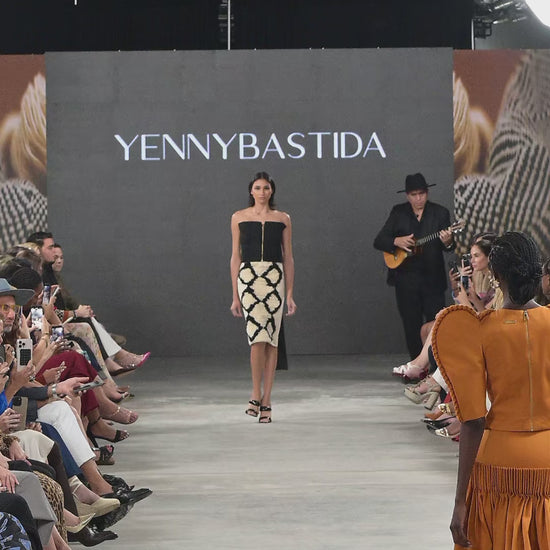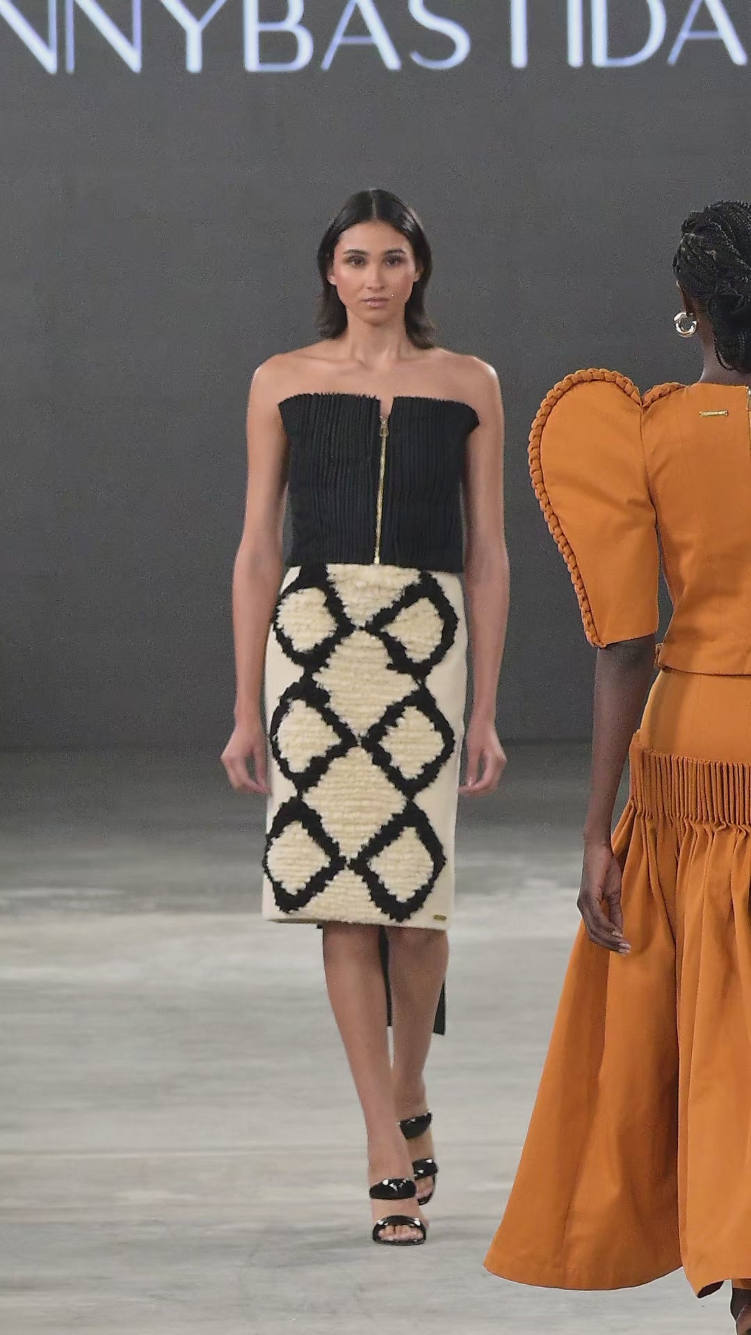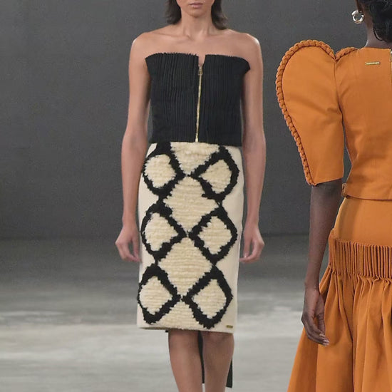 Top elaborado en raso de algodón, intervenido con fino trabajo de manipulación textil mediante costuras simétricas hechas a mano en el frente. Las mangas abullonadas aportan volumen escultórico, y el cierre metálico posterior completa la pieza con sobriedad técnica. Una blusa que transforma la simetría en lenguaje ritual.