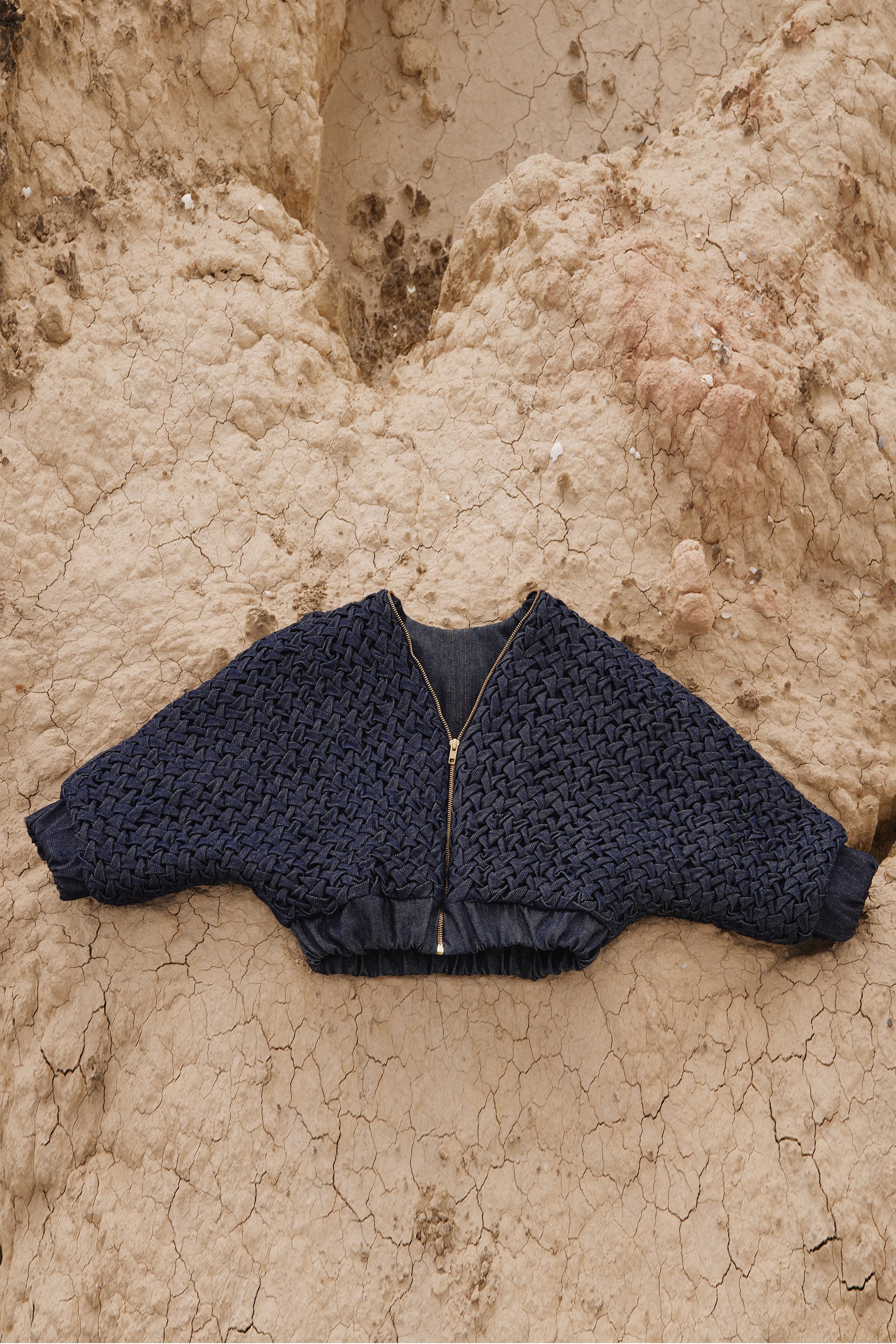 Flame Jacket short, made in denim with a neckline in metallic closure in front, waist and mocked fists, covered with American smocking technique completely handmade. Approximately 60 hours of work.