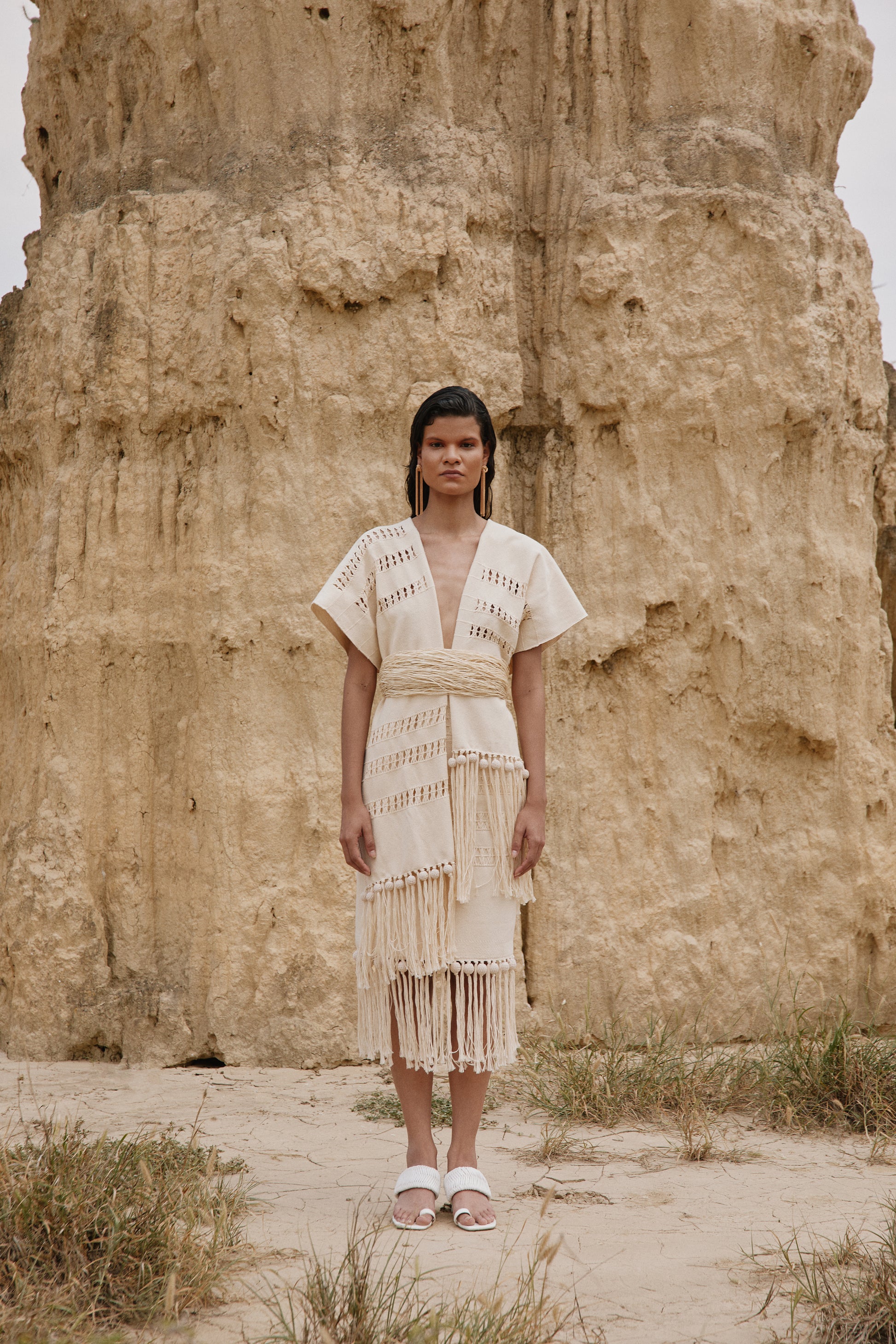 Delicate and long scarf. Made with handmade organic cotton fabrics. Fringe finishes and crochet-lined wooden spheres.