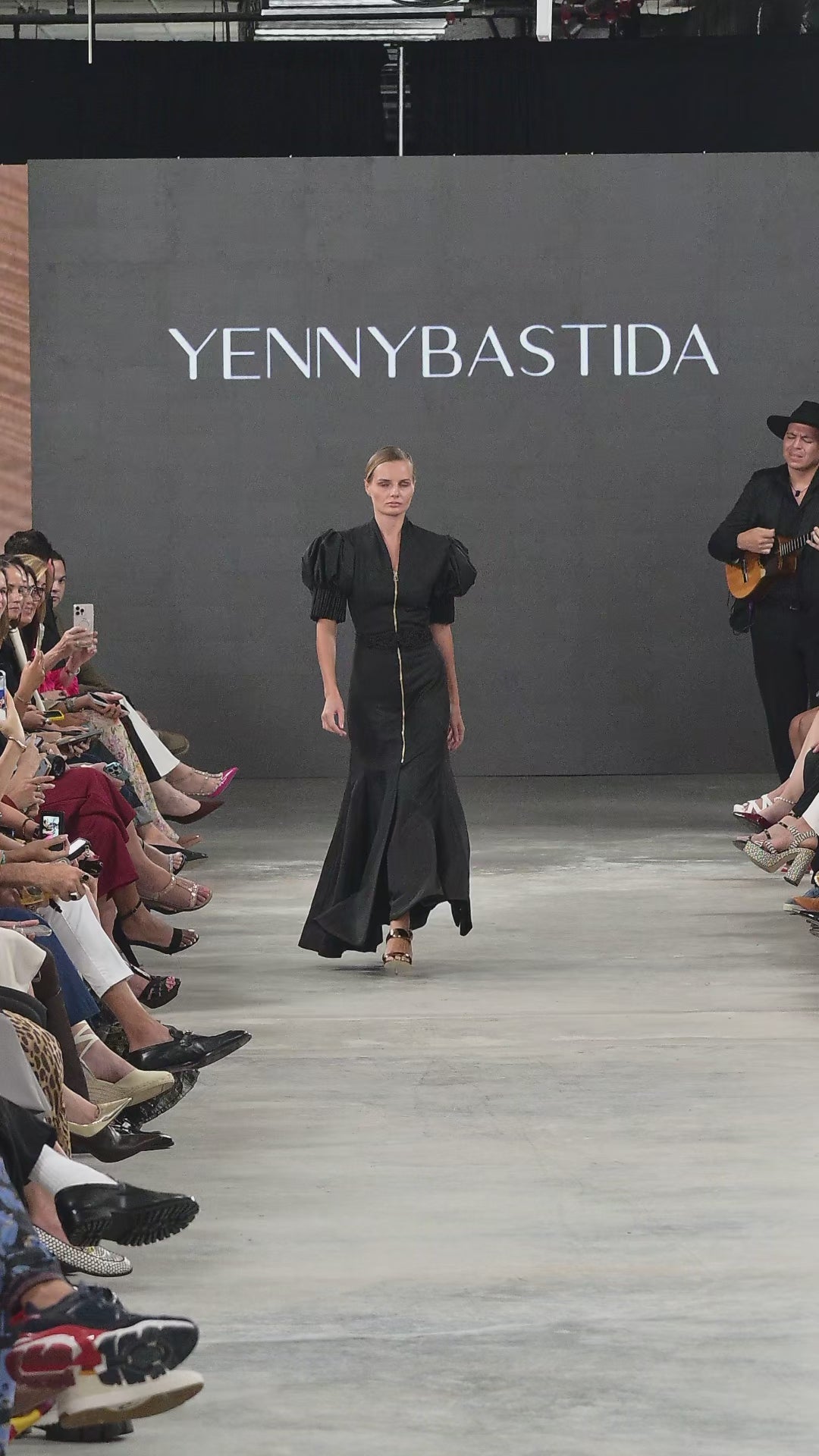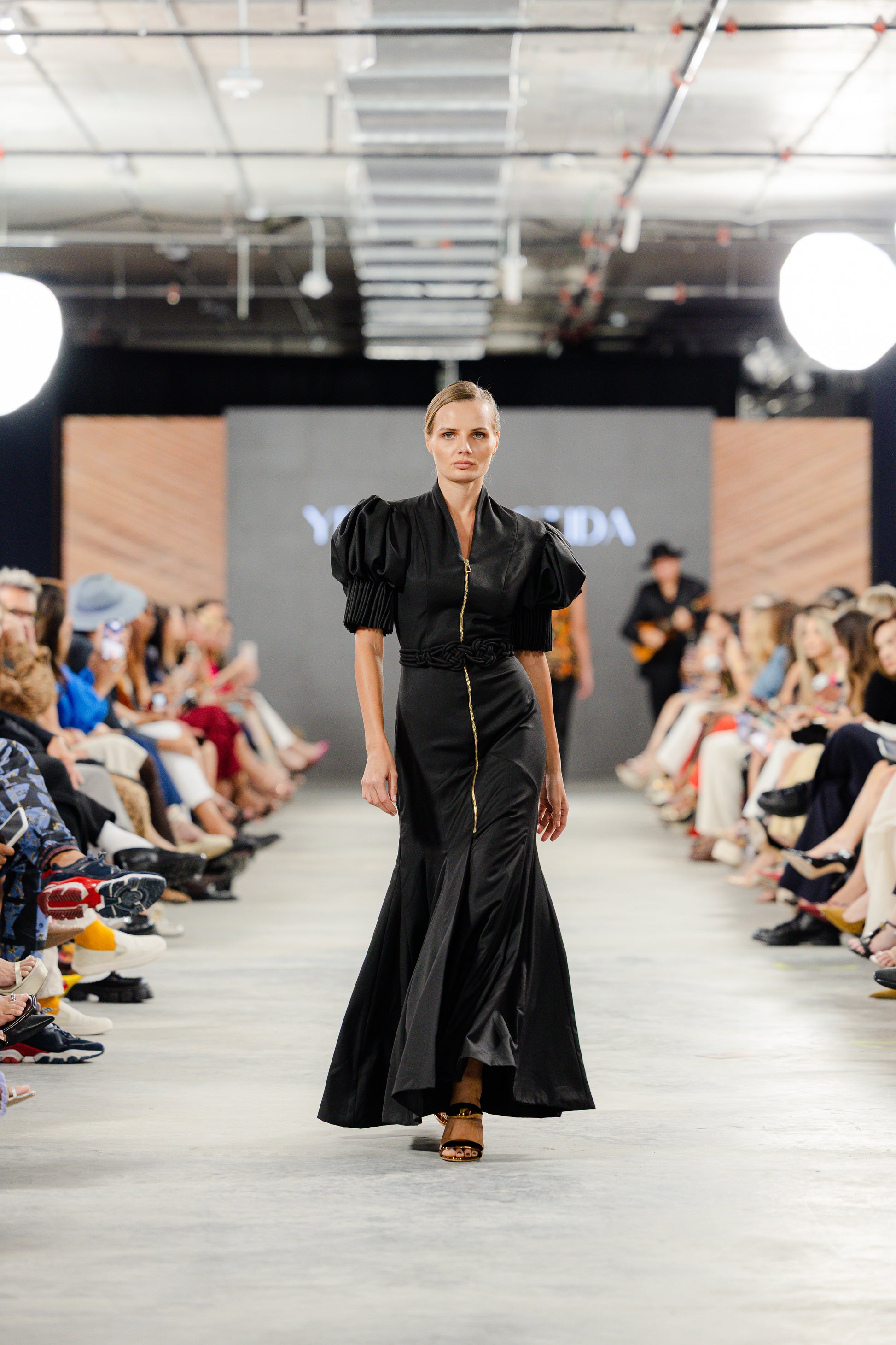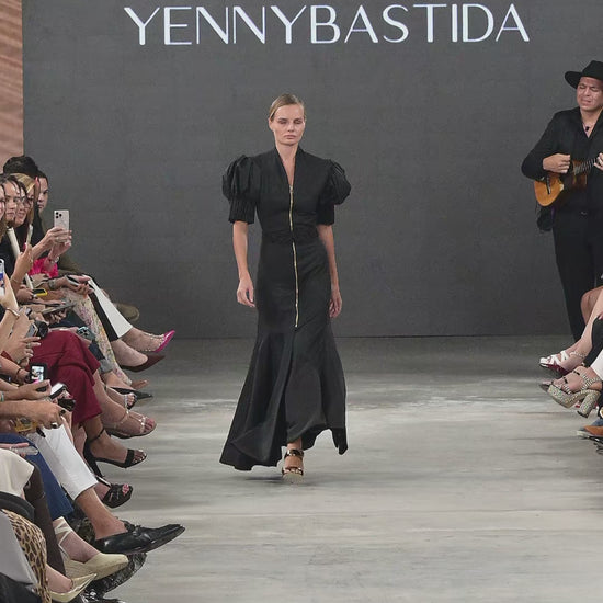 Vestido largo entallado al cuerpo, con múltiples cortes que se extienden hasta la cadera y se amplían en la base mediante quillas que aportan movimiento. Las mangas abullonadas se construyen con costuras en forma de acordeón, y el cinturón tejido en crochet con la misma tela prolonga el gesto artesanal. El cuello de solapa enmarca la pieza con sobriedad estructural. Una silueta que transforma el cuerpo en territorio ceremonial.