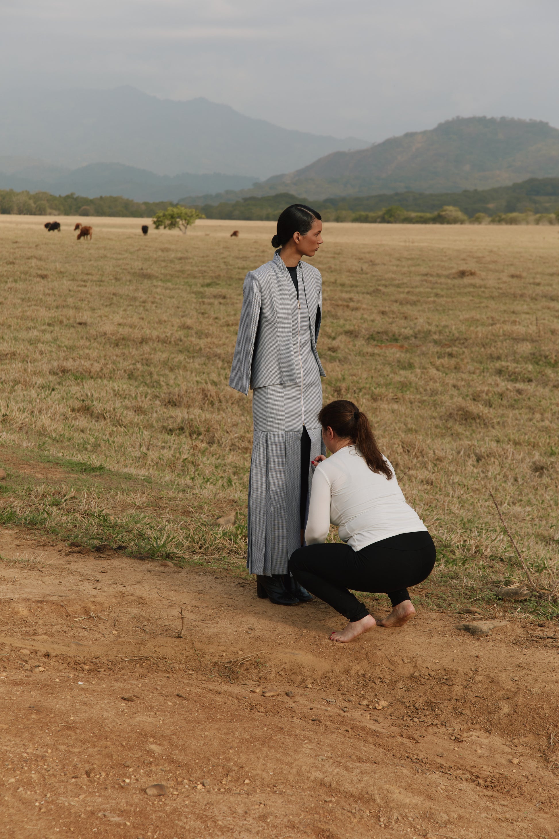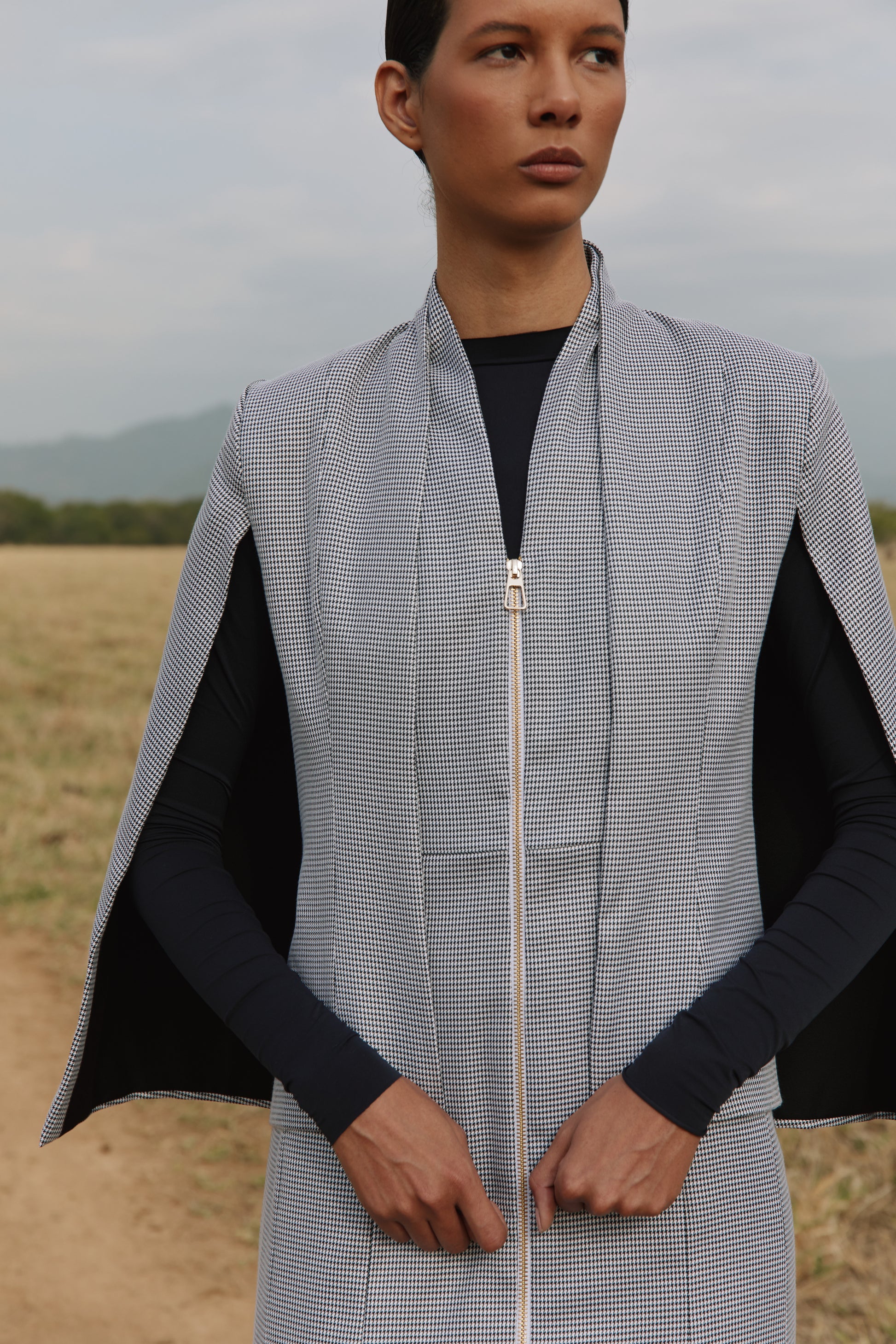 Vestido entallado. Cuello con solapa corrida. Largas tiras, dispuestas a modo de tachones abiertos y sueltos. Elaborado en gabardina italiana. Cierre metálico al frente.