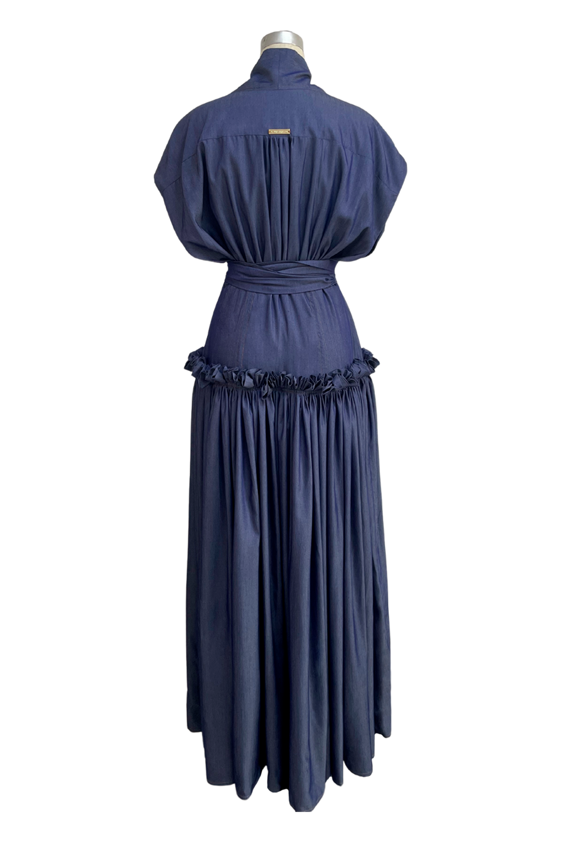 Lapel collar and v-neckline, with loose sleeves that fall on the shoulder, covered buttons by hand, strap at the waist to tie, the skirt is composed of a fitted design at the hip and then long pleated at the end.