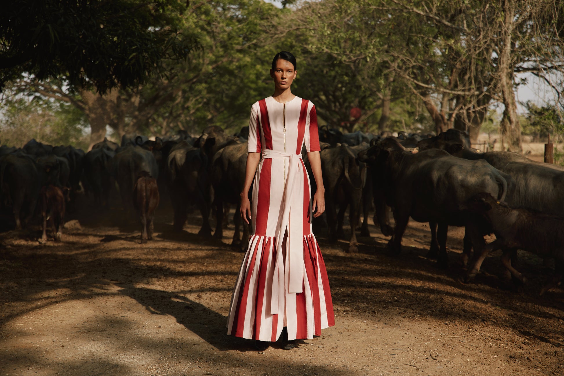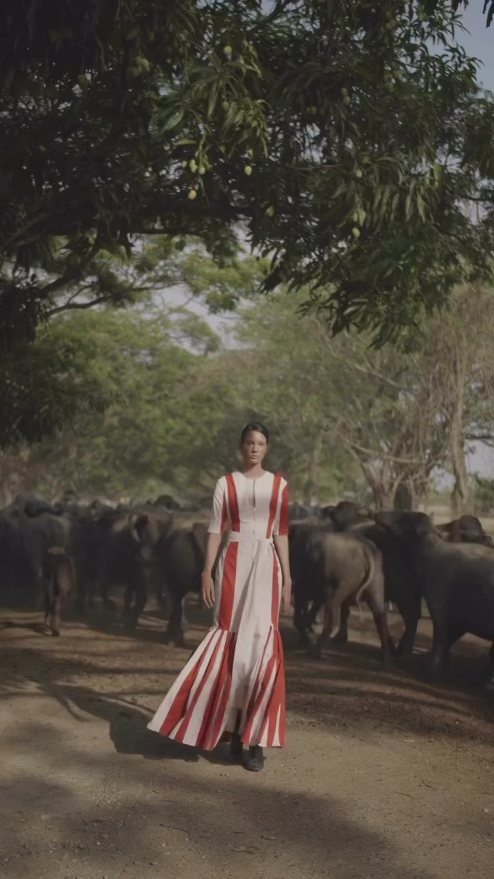 Vestido largo multiuso de corte entallado. El cierre metálico con doble slider al frente, permite usarlo como capa o sobretodo. Profusa falda abullonada al final y tiras para amarrar. Elaborado en raso de algodón de dos colores.
