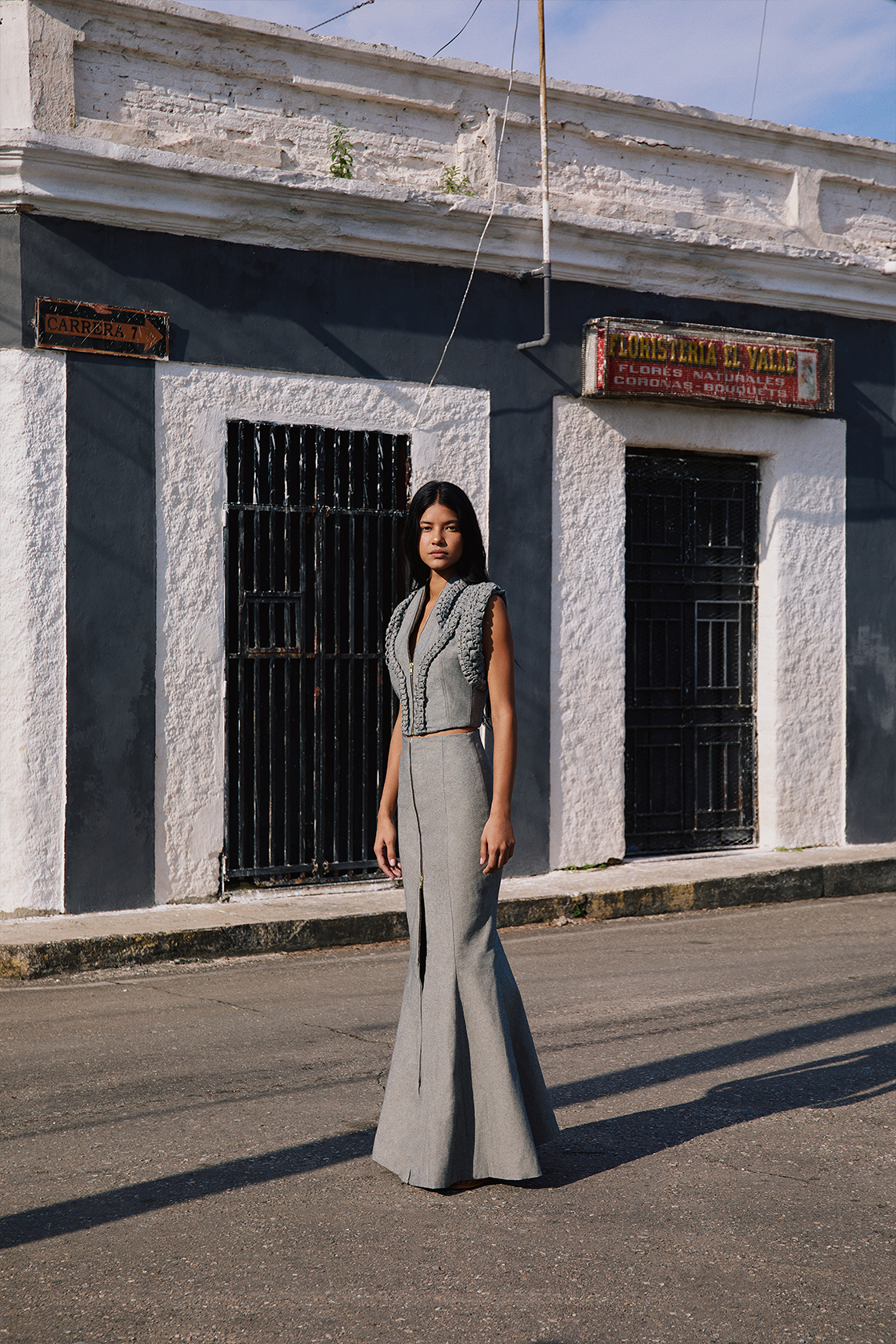 Long skirt with fitted mermaid cut. Made of drill, front metal zipper.