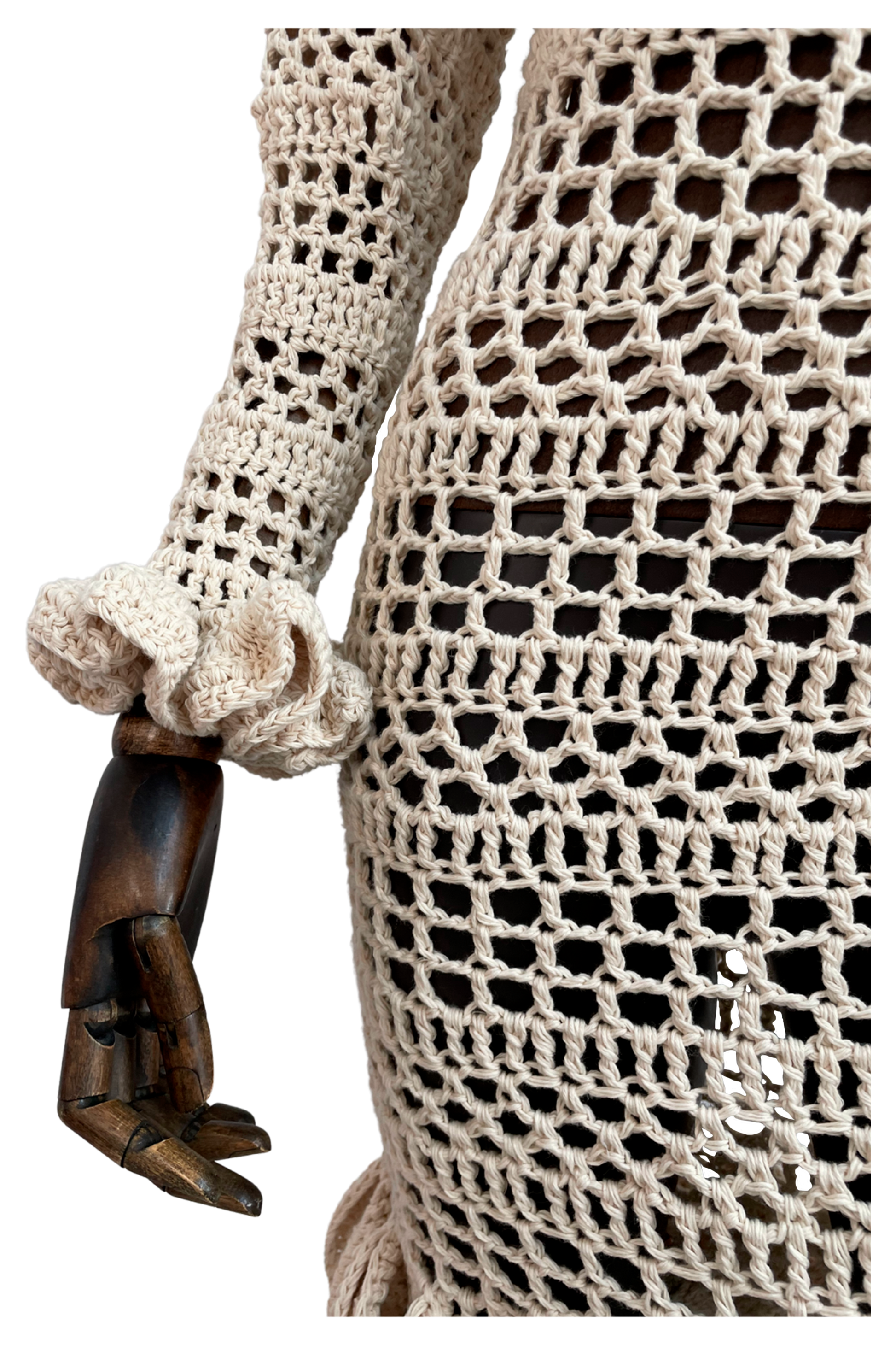 Short hand-knitted dress in crochet technique, long sleeves and ruffles on the hem and cuffs.