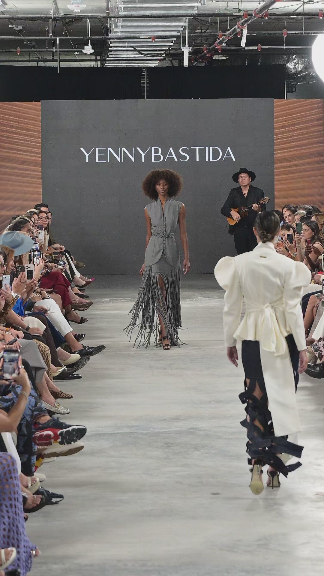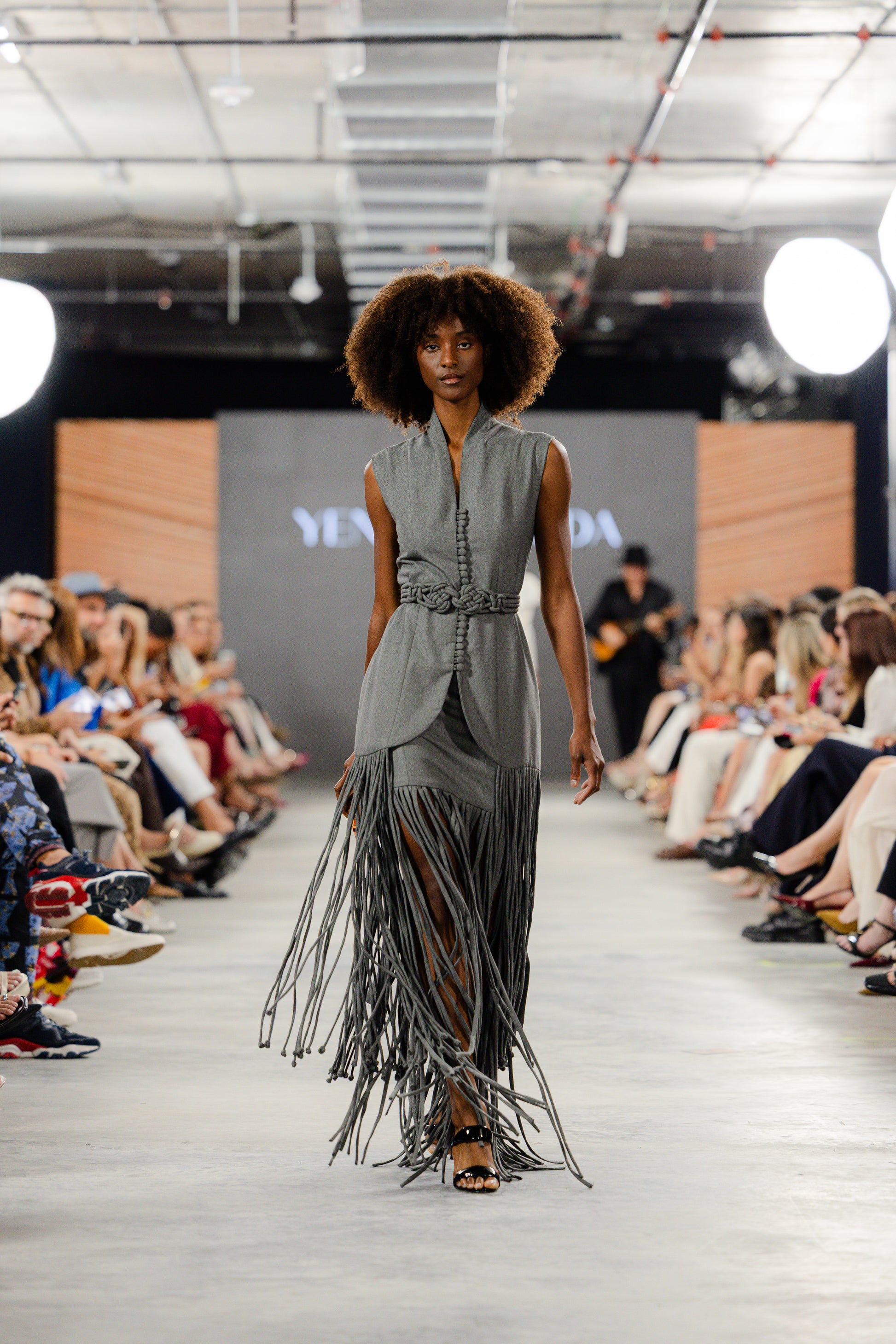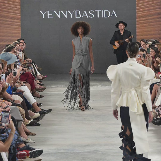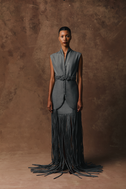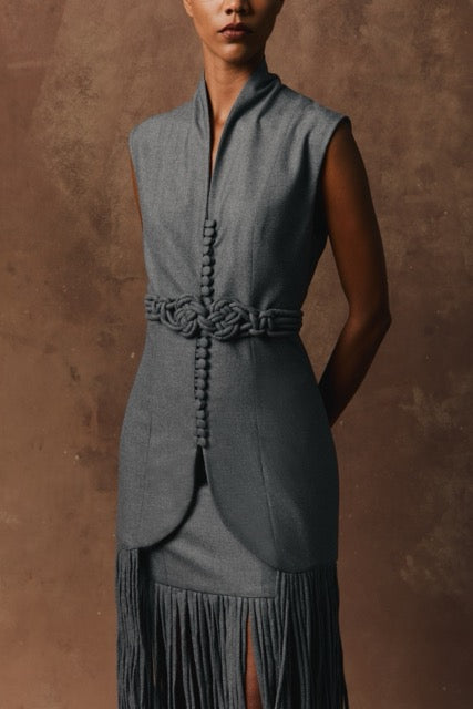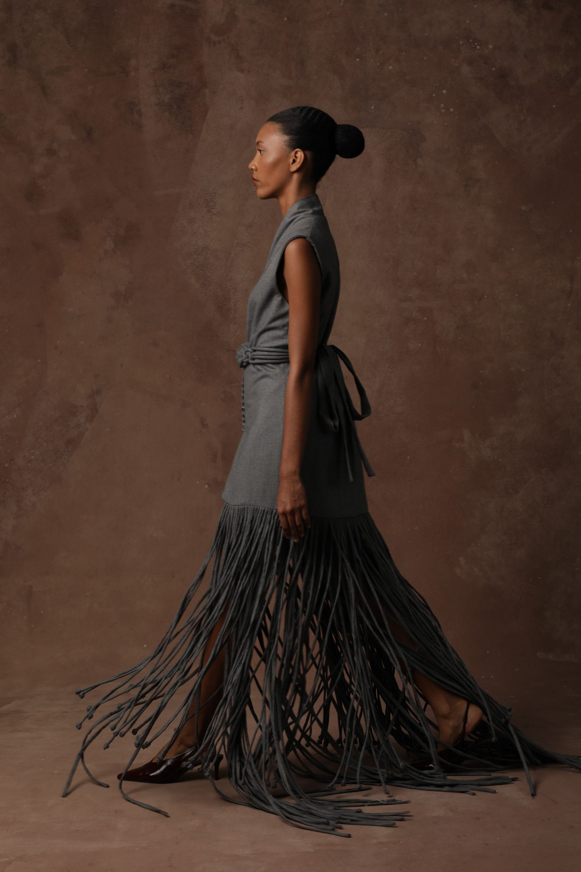 Chaqueta larga de silueta entallada con cuello de solapa. Incluye cinturón removible en macramé artesanal, botones forrados a mano y flecos en el borde que evocan gestualidad textil y movimiento ritual.