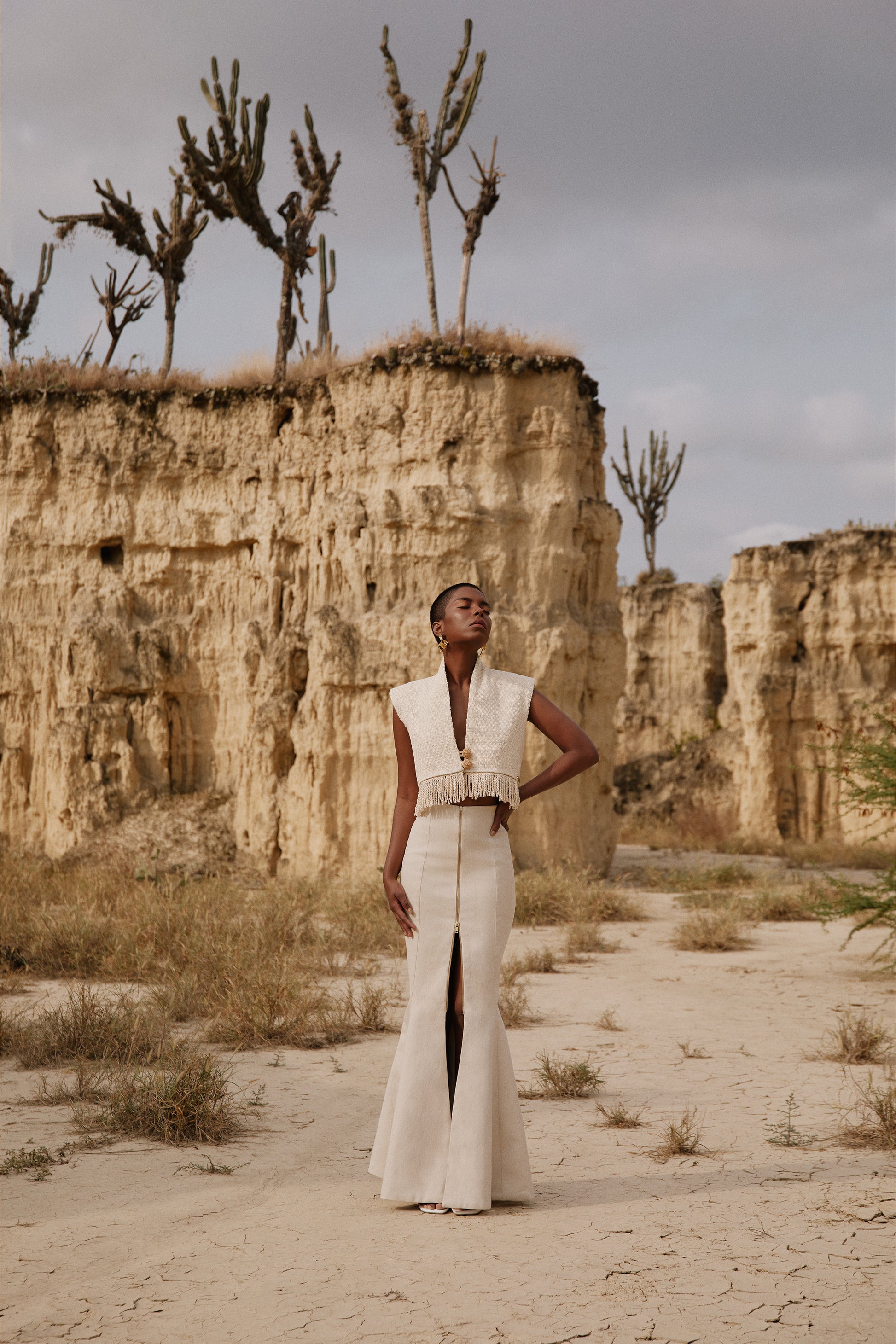 Vest corto. Elaborado en una base de canvas, y una tela exclusiva hecha en telar artesanal, creado con algodón natural y fibra de Curagua. Esta fibra es 100% artesanal , cultivada y procesada en Aguasay, estado Monagas. En el borde, flecos de crochet hechos a mano.