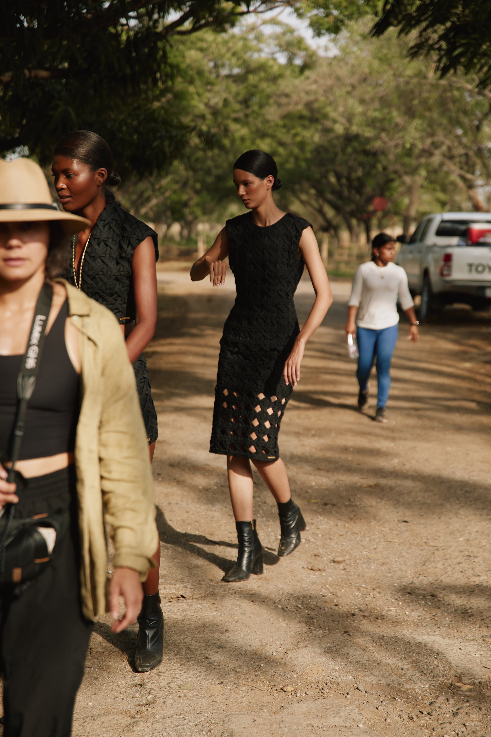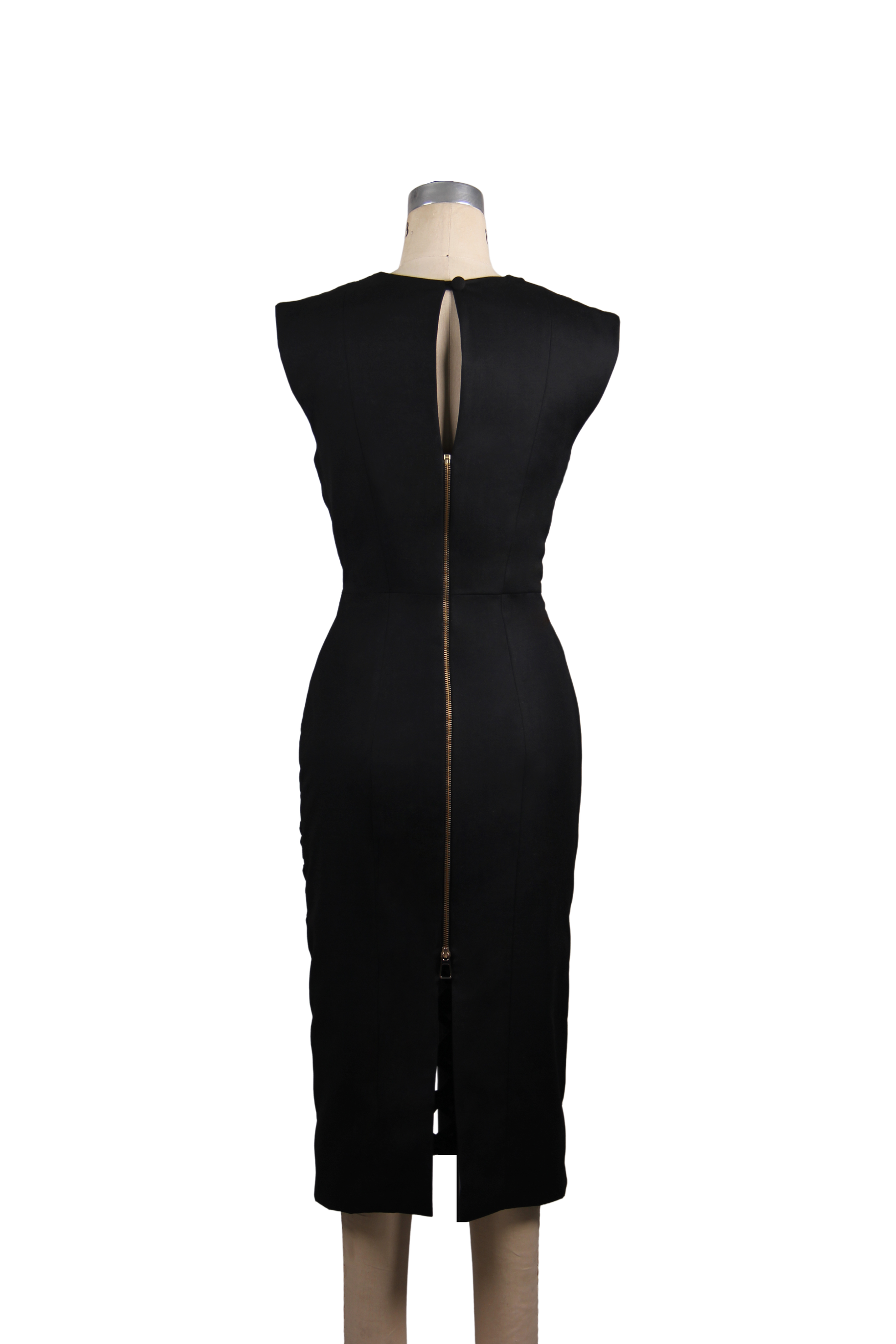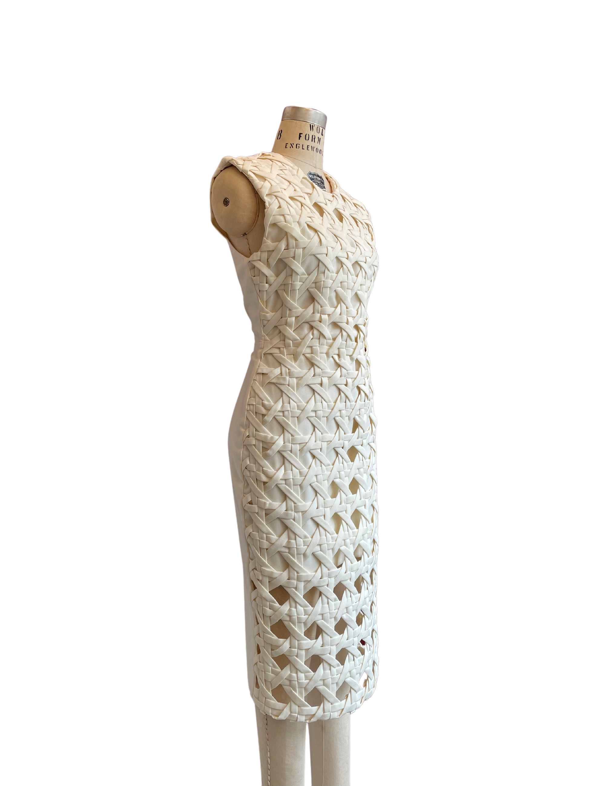 Vestido entallado y largo hasta media pierna. Cuello redondo. Elaborado en gabardina italiana. Recubierto con fina técnica de tejido a mano en la misma tela. Cierre metálico en la parte posterior. 60 horas de trabajo manual en su elaboración.