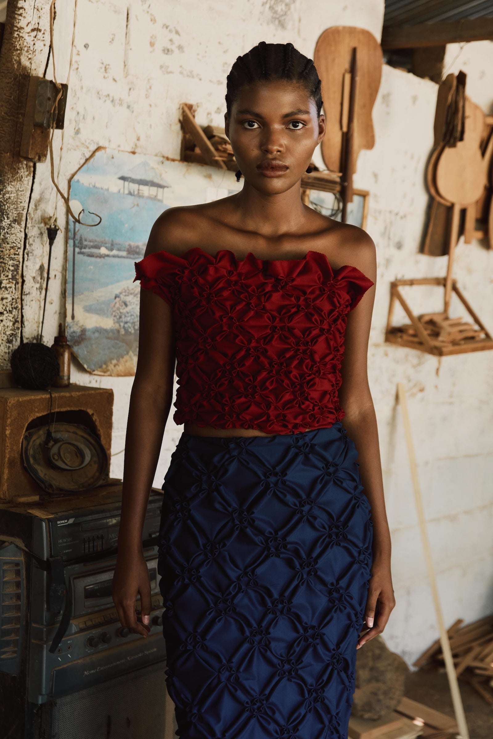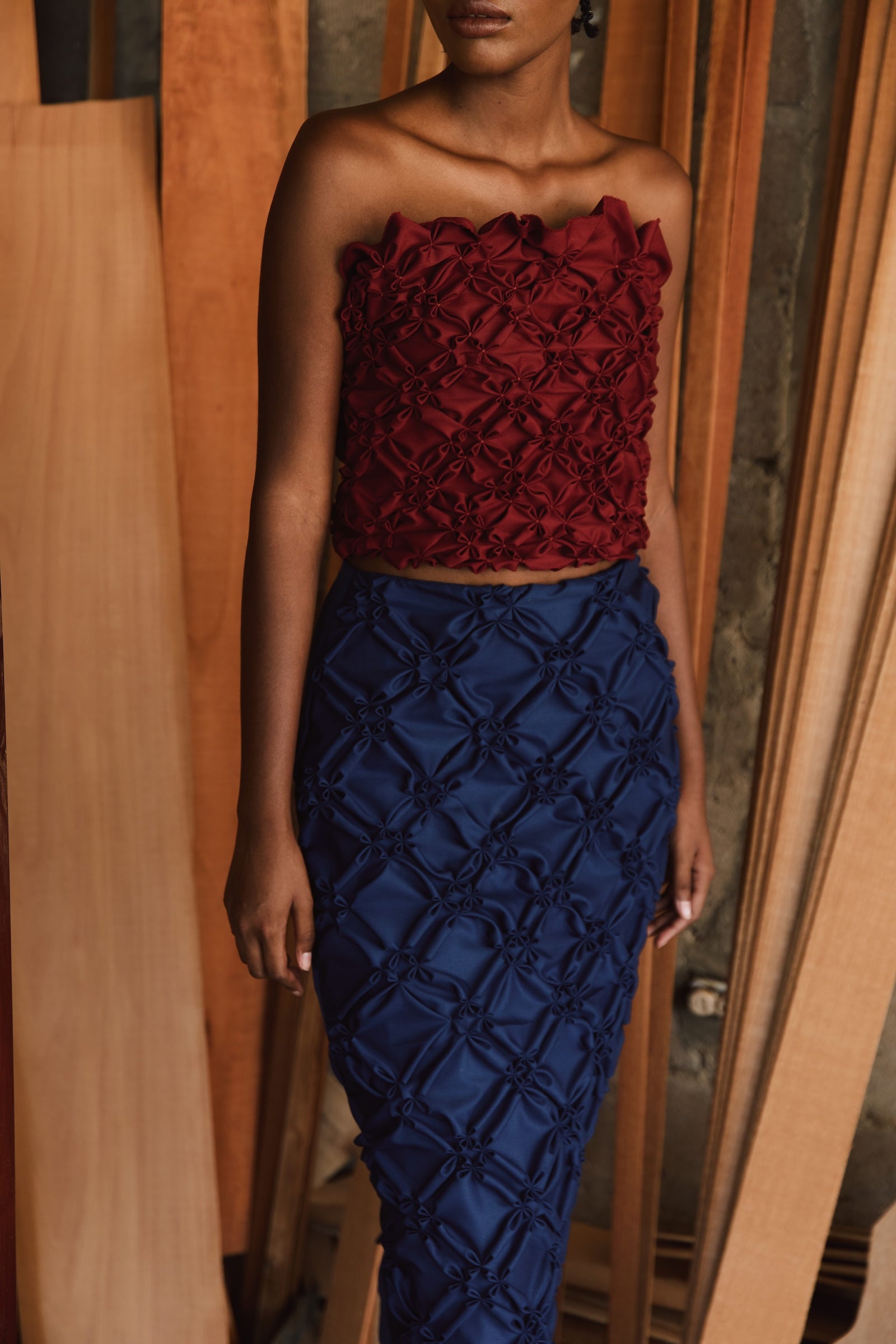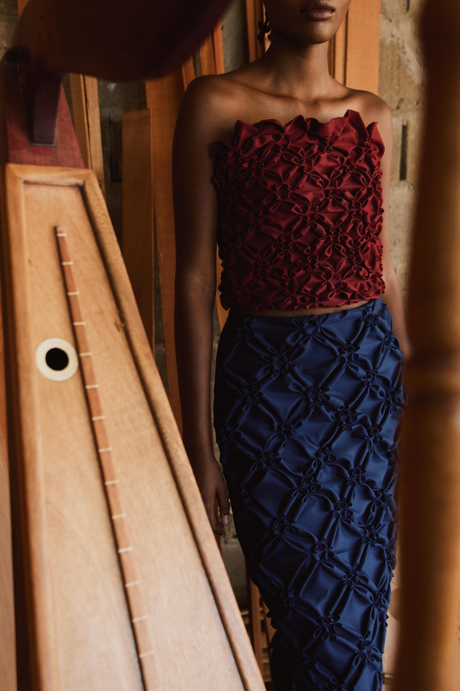 Bustier corto. Técnica de confección tipo smocking canadiense, elaborado a mano. 30 hrs de trabajo manual.