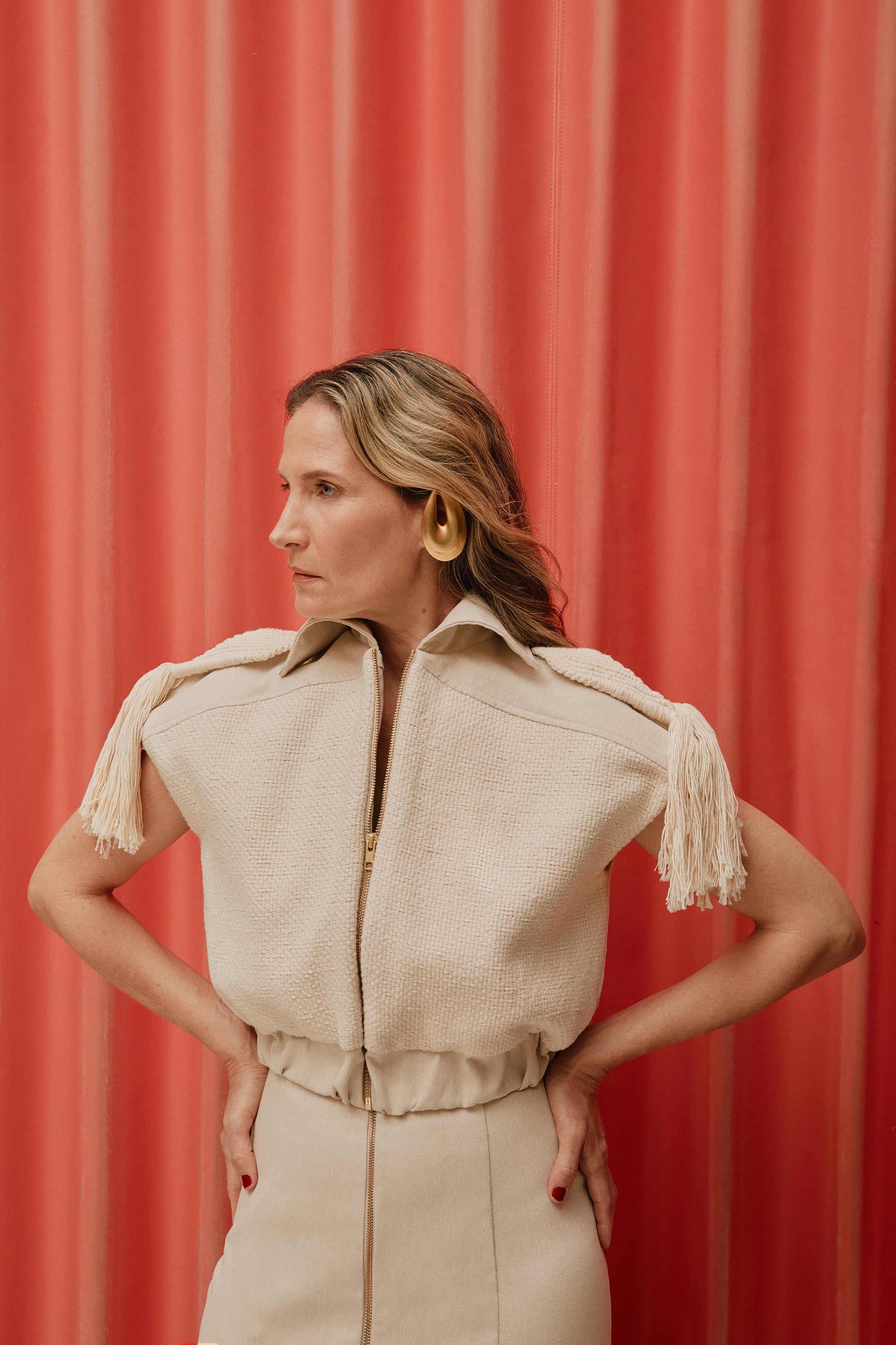 Short Jacket with metal zipper, high collar and handmade fabric, removable shoulder pads made of macramé.